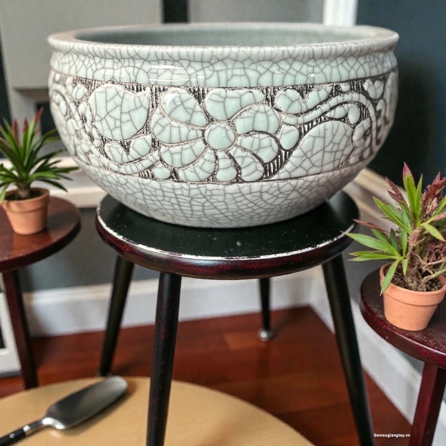 Ang thống men rạn khắc tay hoa cúc dây, tượng trưng cho yêu thương kết nối.
