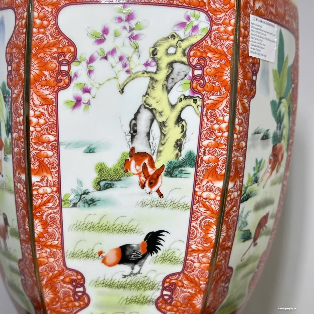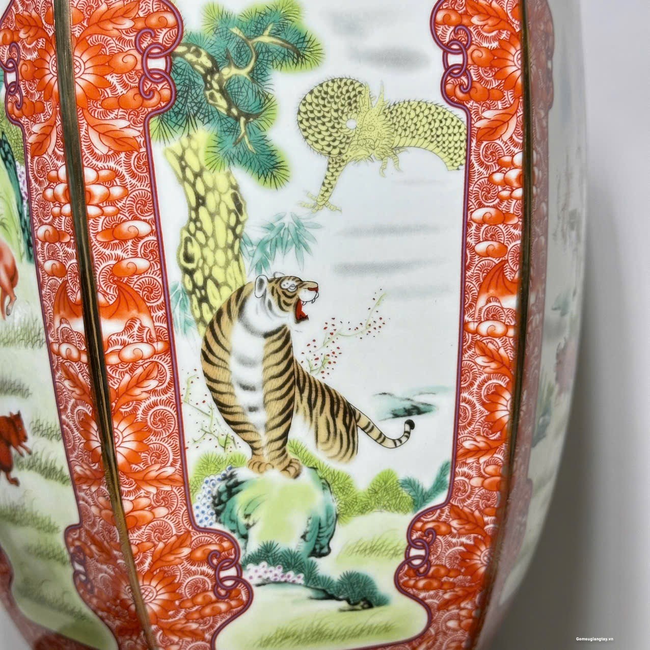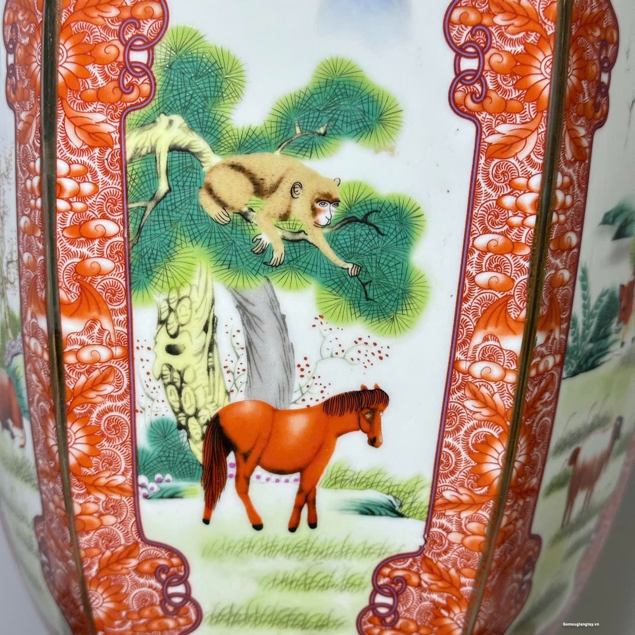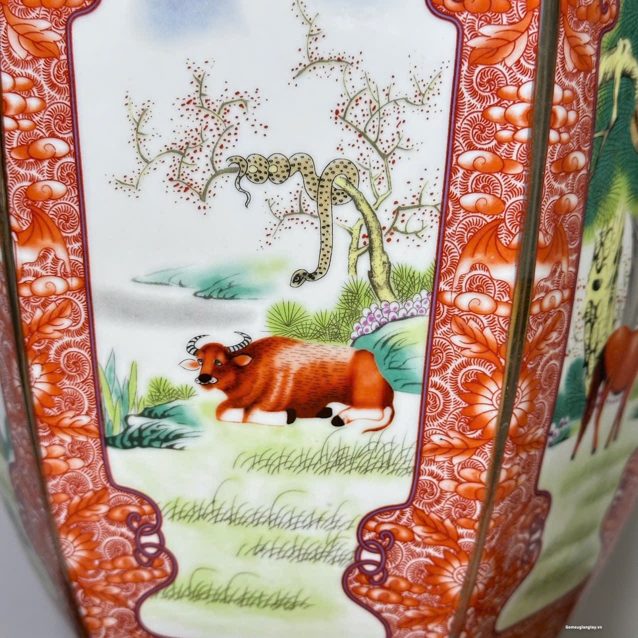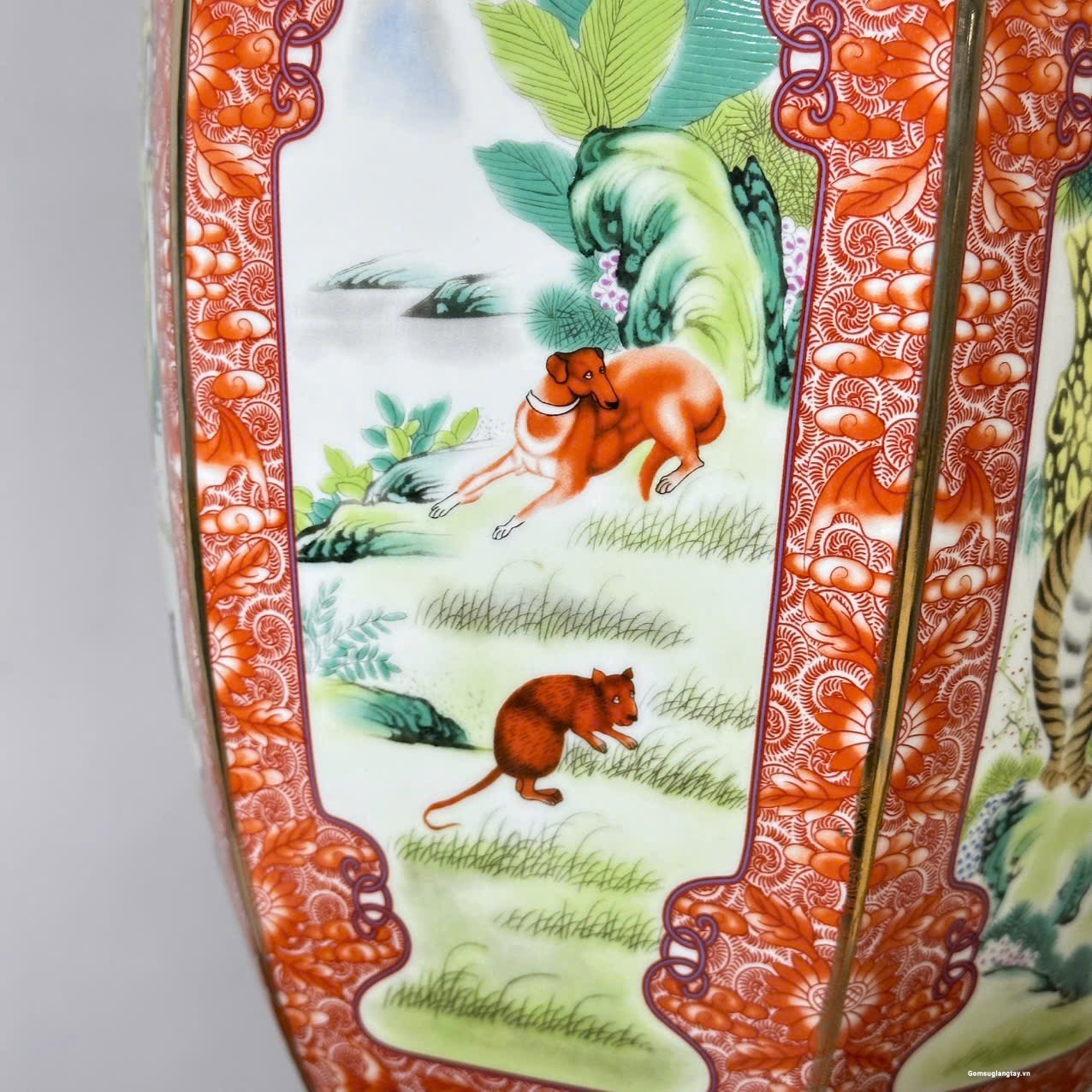 Bình vẽ 12 con giáp kiểu bình lục zác viền vàng, sang trọng.