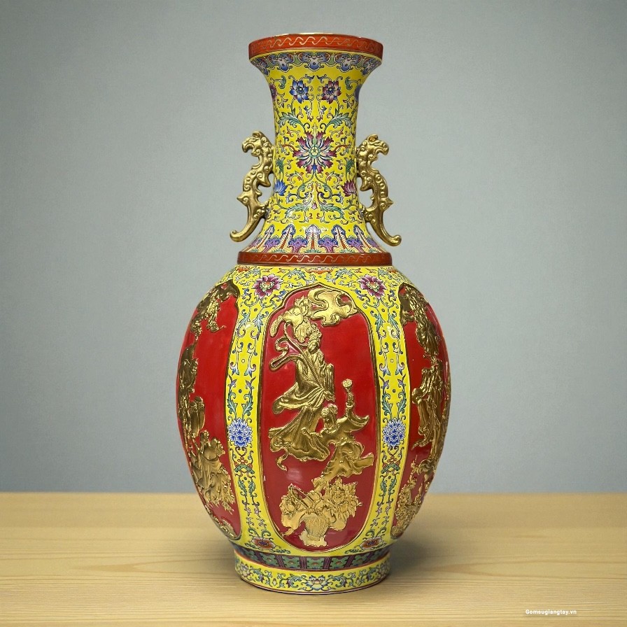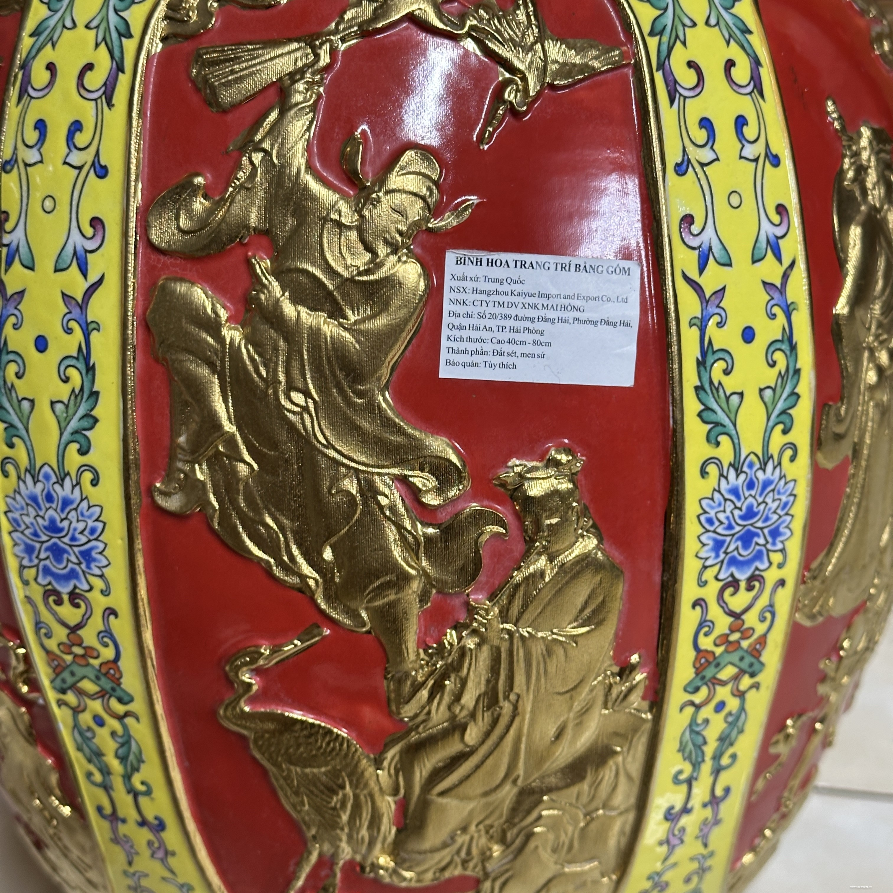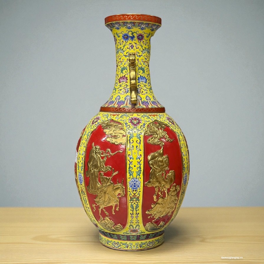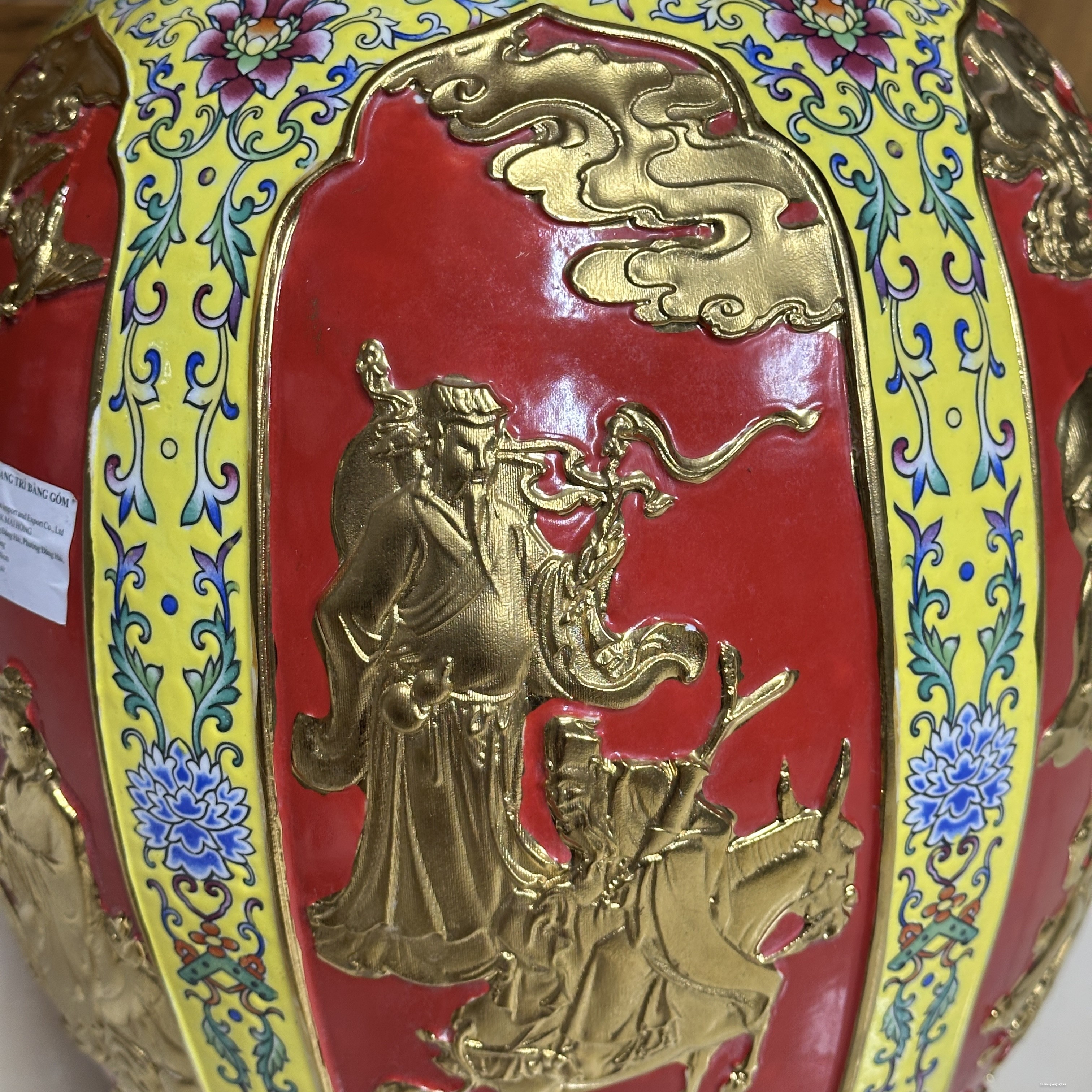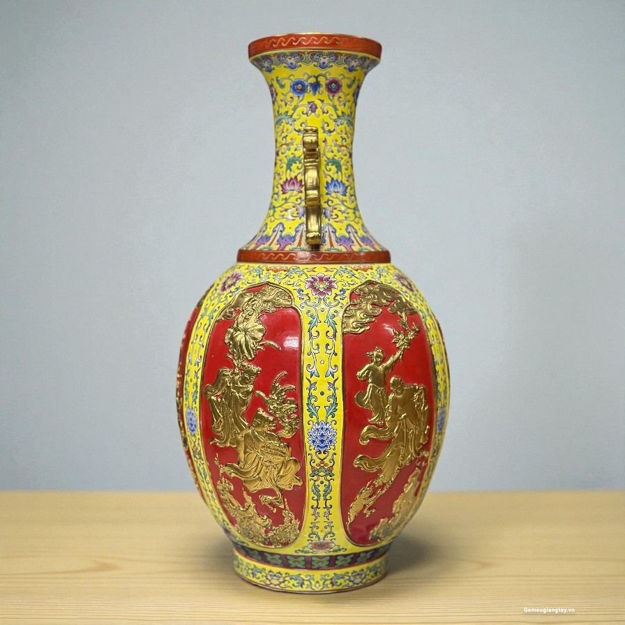 Bình củ tỏi vẽ vàng khắc nổi tích Bát tiên vô cùng đẹp, hàng độc bản nung với nhiệt độ 1800 ° ba lần lửa.