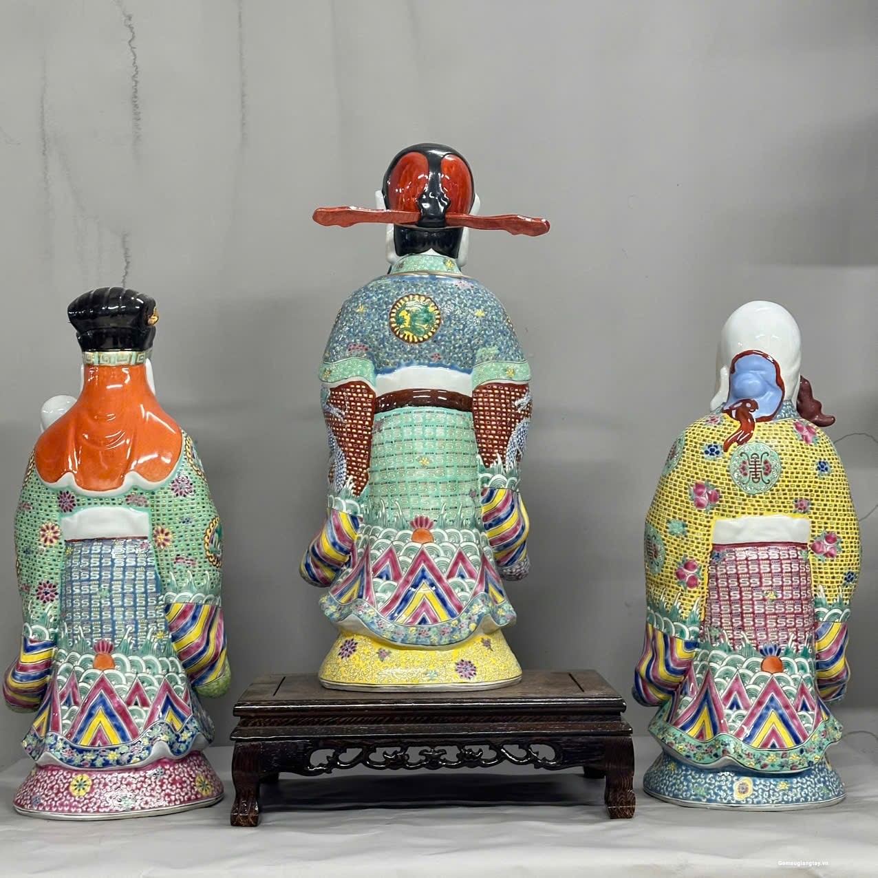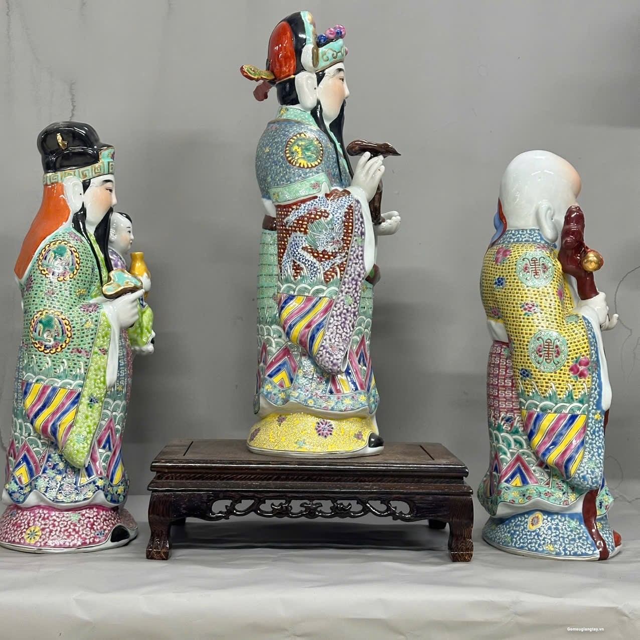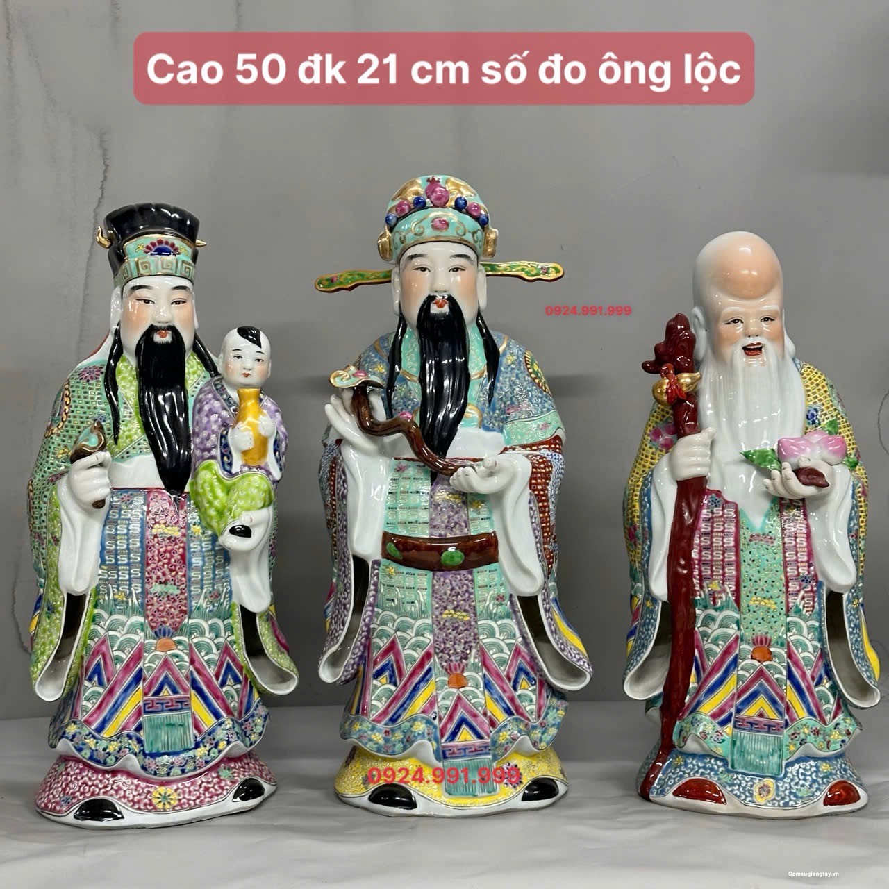 Bộ tượng Tam Đa phúc lộc Thọ áo gấm rất đẹp, nung với nhiệt độ cao 1800 ° hàng áo vẽ tay rất kỳ công.