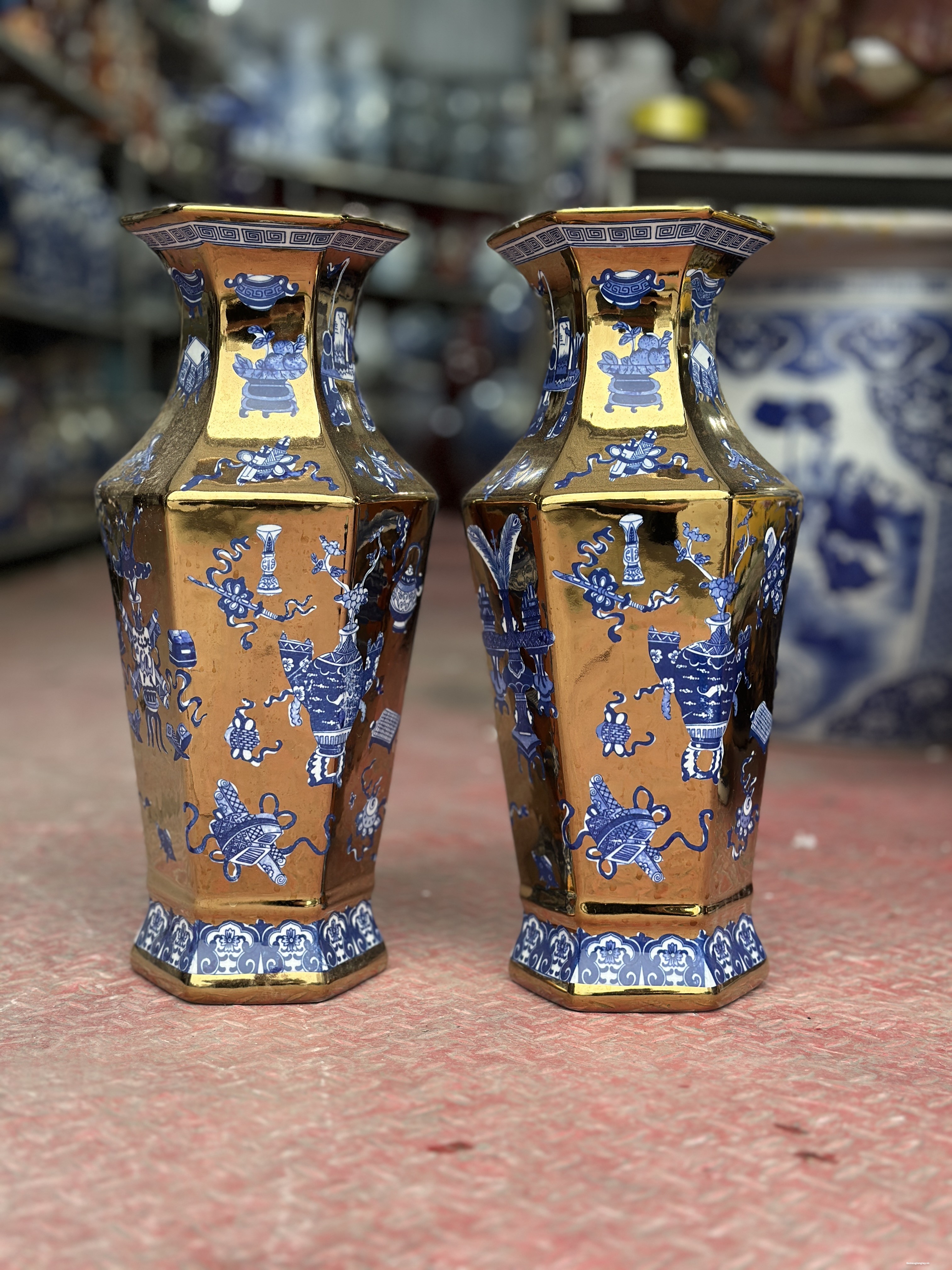 Đôi lục bình vẽ tay tích cổ đồ họa mạ vàng lục giác vô cùng đẹp, nhìn cổ kính sang trọng, dùng để trang trí trưng bày hoặc là để cắm hoa.