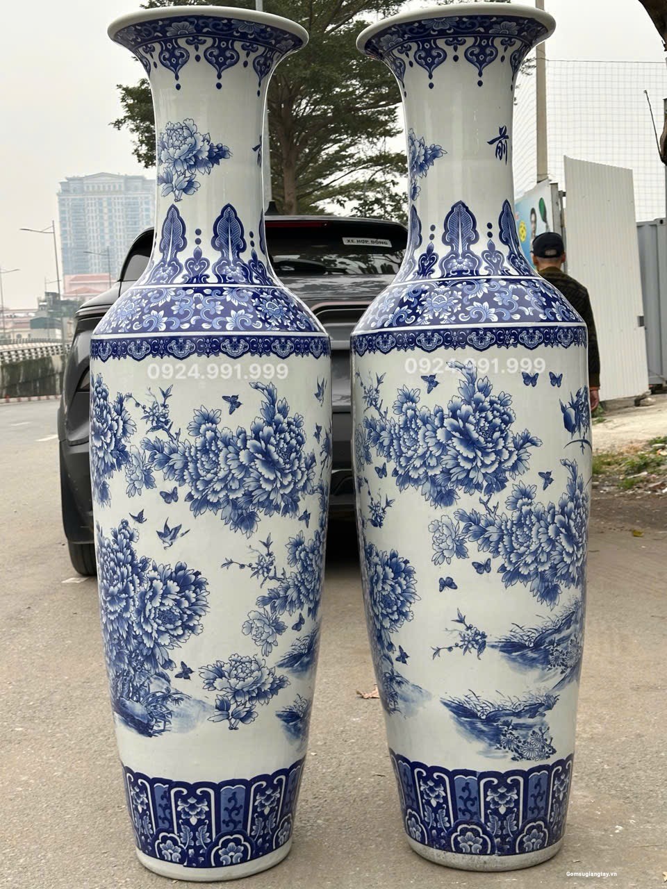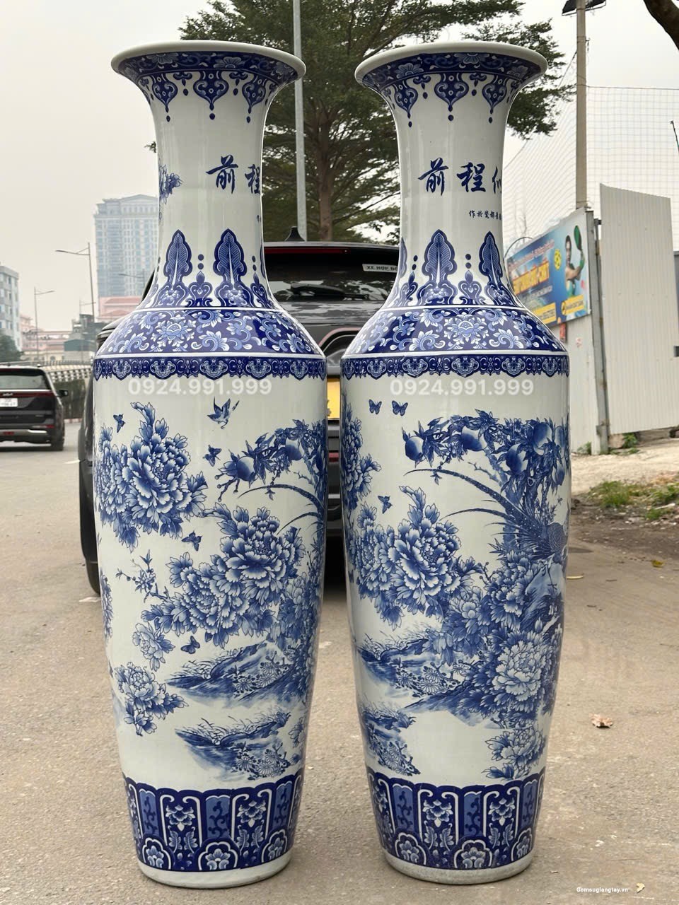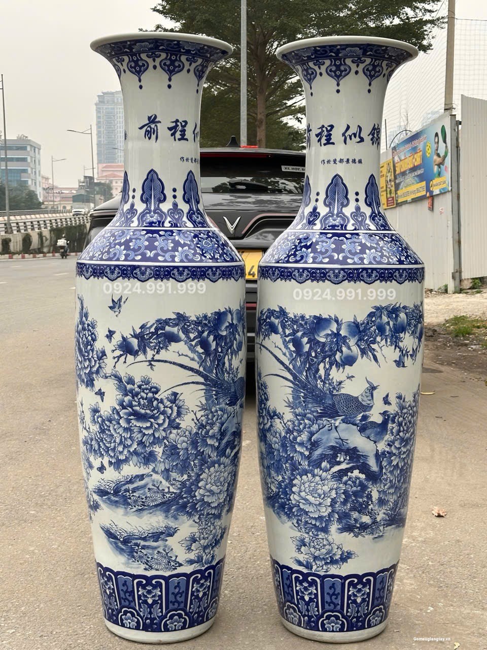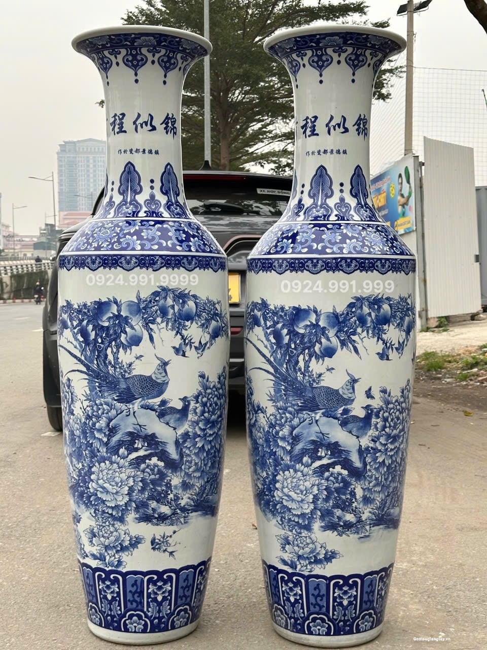 Cặp lục bình tích Bách Điểu Chầu Phượng là mẫu gốm sứ phong thủy được ưa chuộng nhờ vẻ đẹp cổ điển và ý nghĩa cát tường. Họa tiết phượng hoàng uy nghi kết hợp đàn chim tụ hội tượng trưng cho phú quý, thịnh vượng, quy tụ tài lộc và quý nhân phù trợ. Dáng bình cao, thân nở, miệng loe tạo cảm giác vững chãi, rất phù hợp đặt phòng khách, sảnh lớn, biệt thự, cơ quan, nhà thờ họ hoặc hai bên ban thờ trang nghiêm. Men xanh lam giả cổ sâu màu, sang trọng, giúp tổng thể nổi bật và bền đẹp theo thời gian.