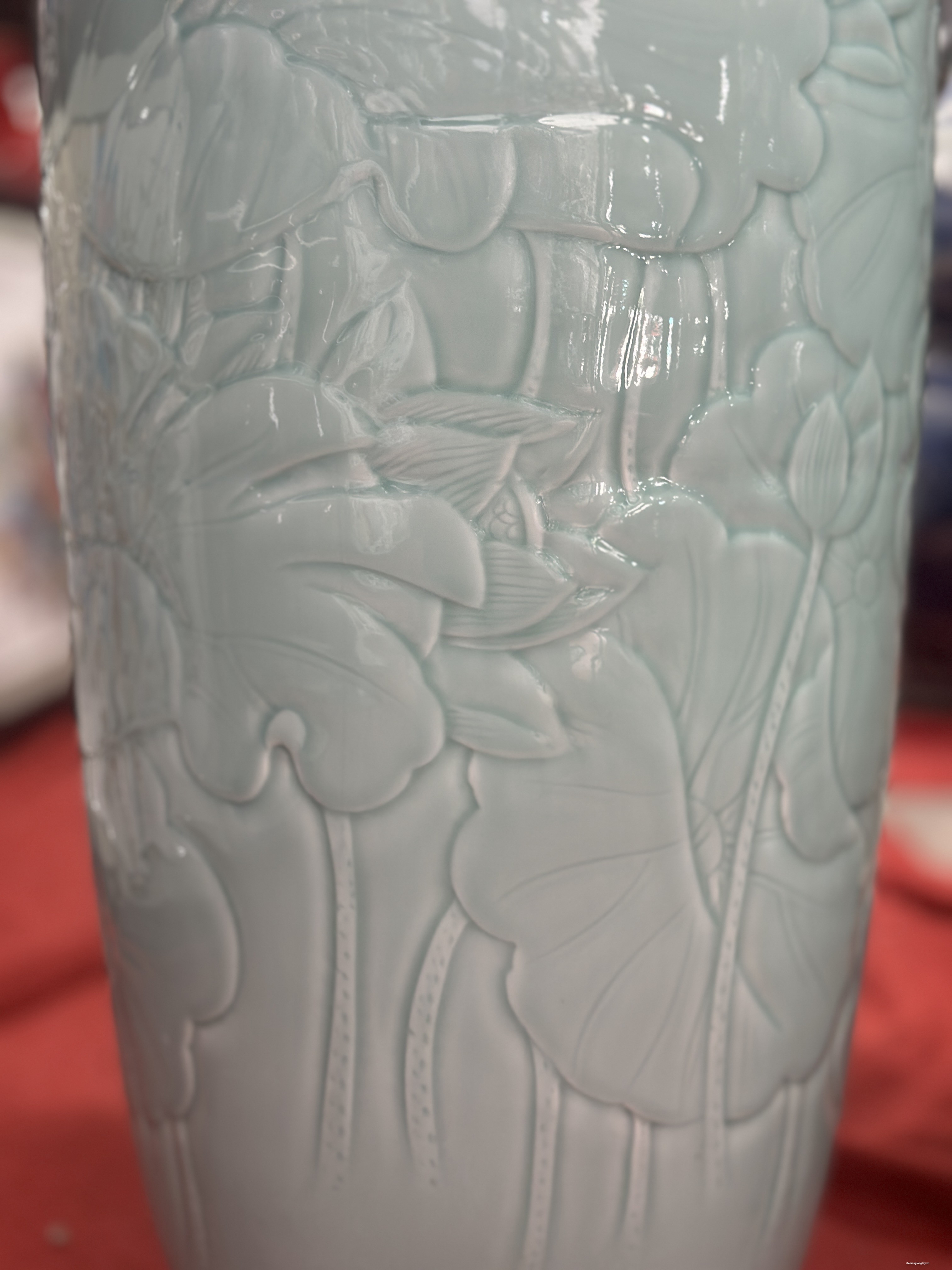 Đôi lục bình men xanh ngọc khắc tay thủ công hoa sen, rất đẹp sắc nét, da sáng như gương.