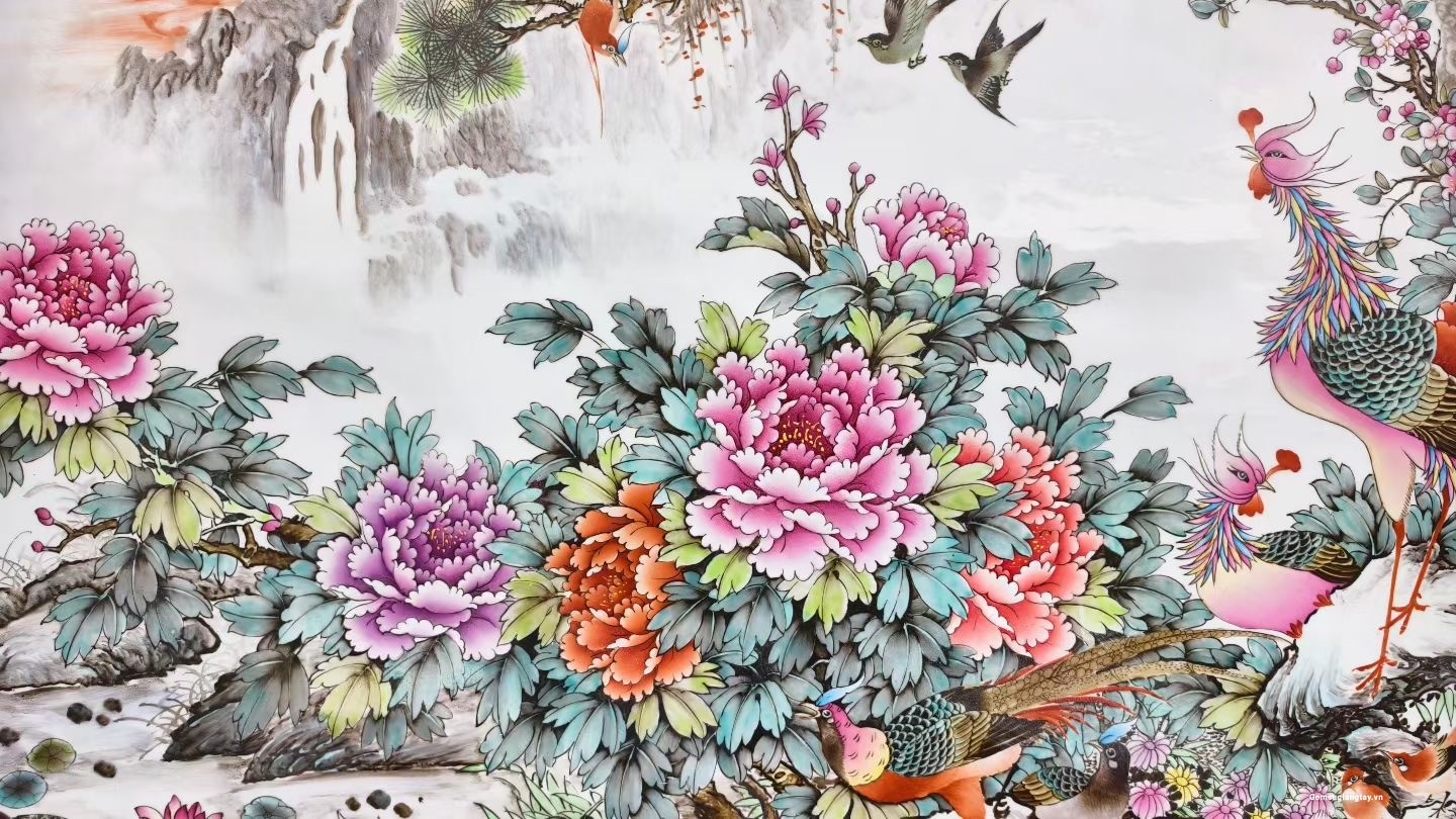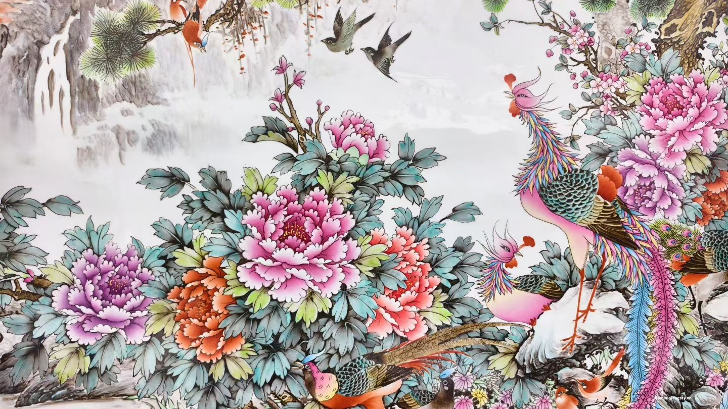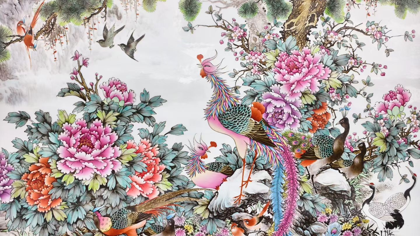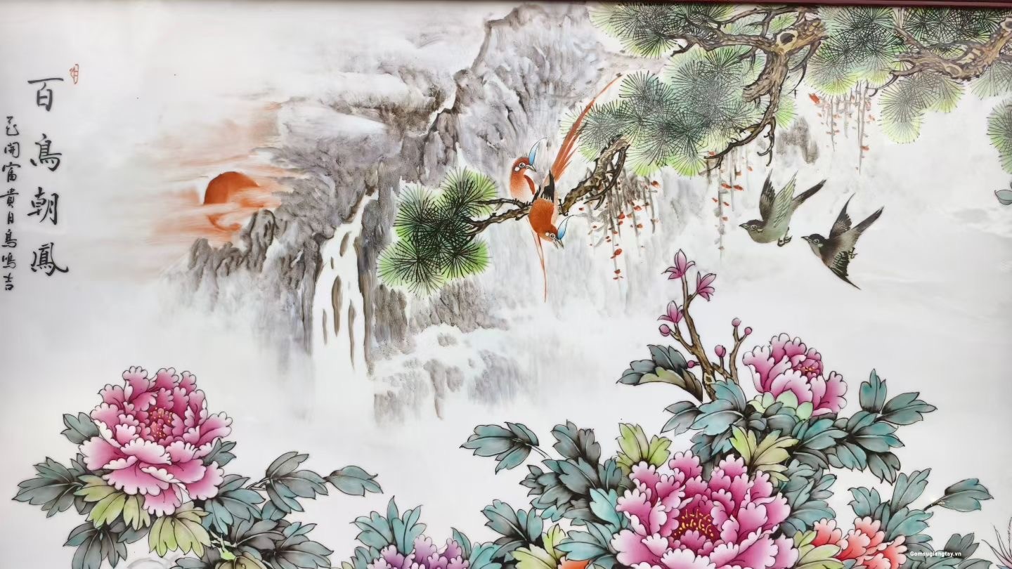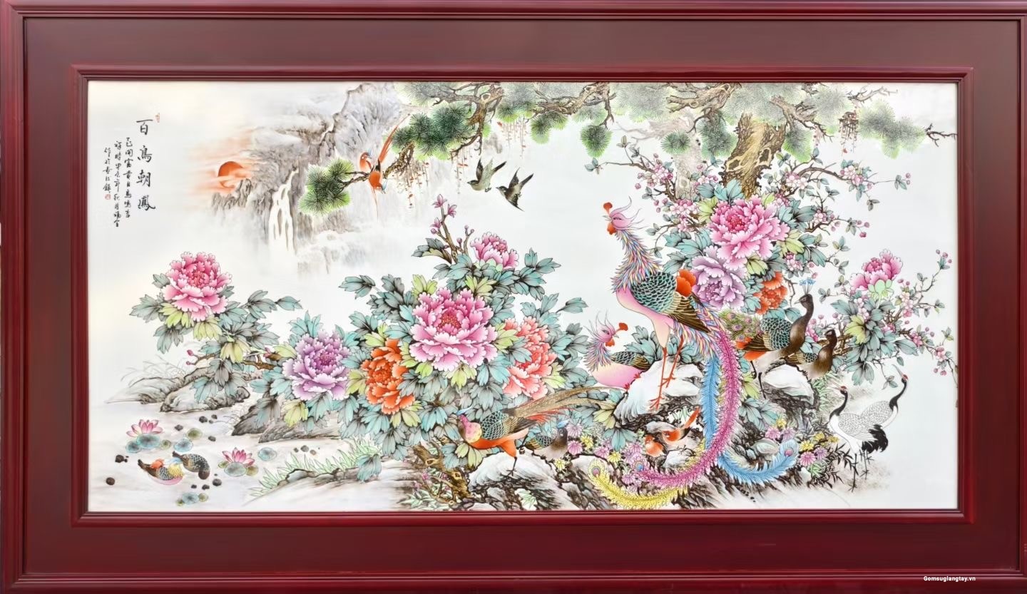 Tranh vẽ tay hàng cao cấp của nghệ nhân có cấp sổ nghệ nhân, vẽ bách điểu trầu phượng, điểm nhấn là nét đẹp hoàn, nét vẽ tơ tóc có hồn từ nhánh cây từ cánh hoa bồng bềnh, tìe con chim uyển chuyển đều được các nghệ nhân tỉa tót tỉ mỉ rất công phu, tạo nên một tuyệt phẩm hồn nhiên yên bình, tranh được nung với nhiệt độ cao 1.800 ° và nung đến ba lần lửa nên rất bền đẹp.