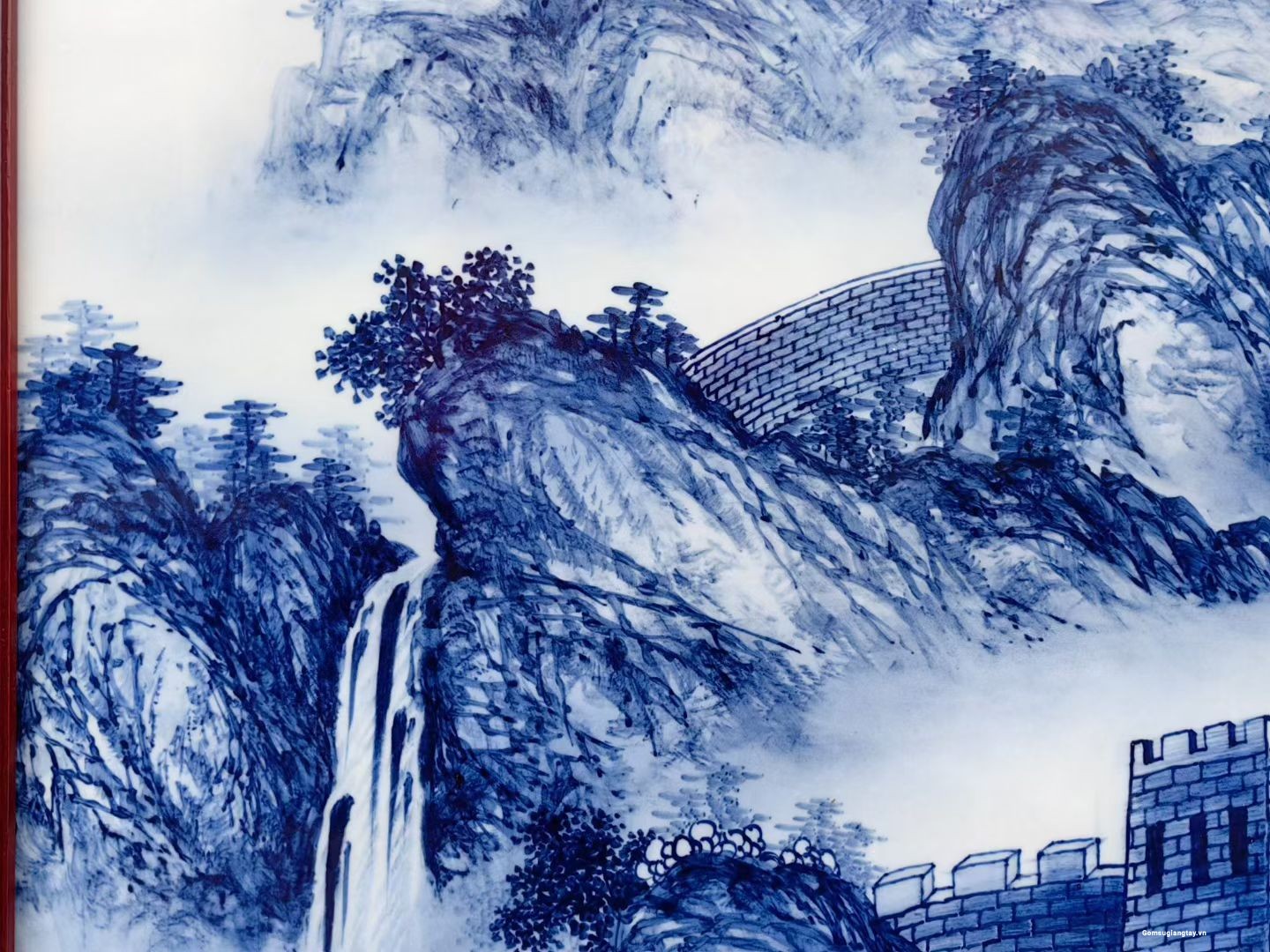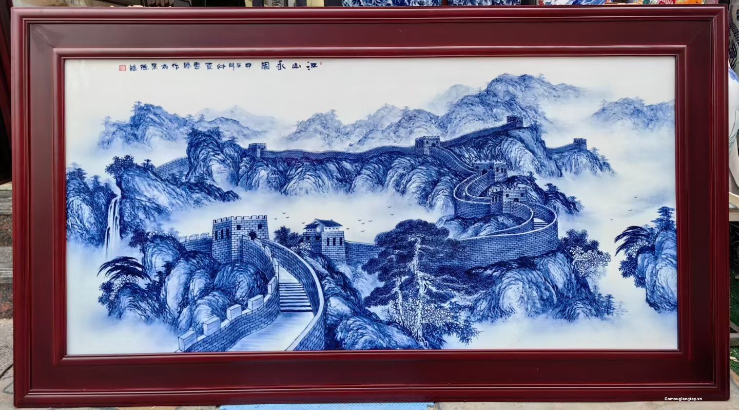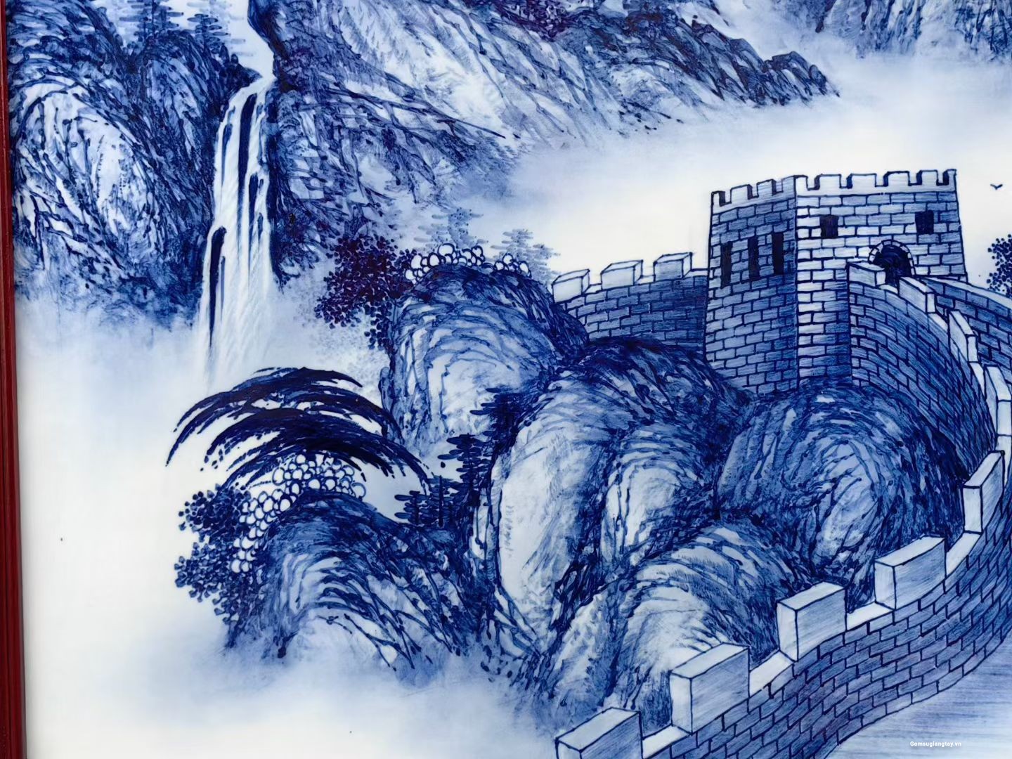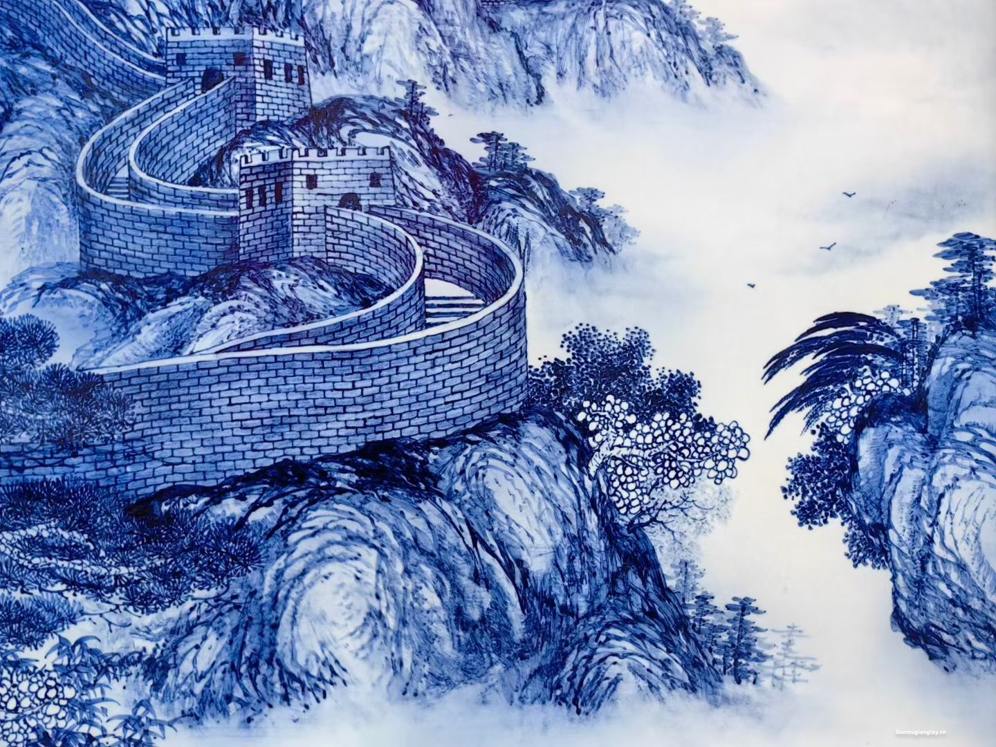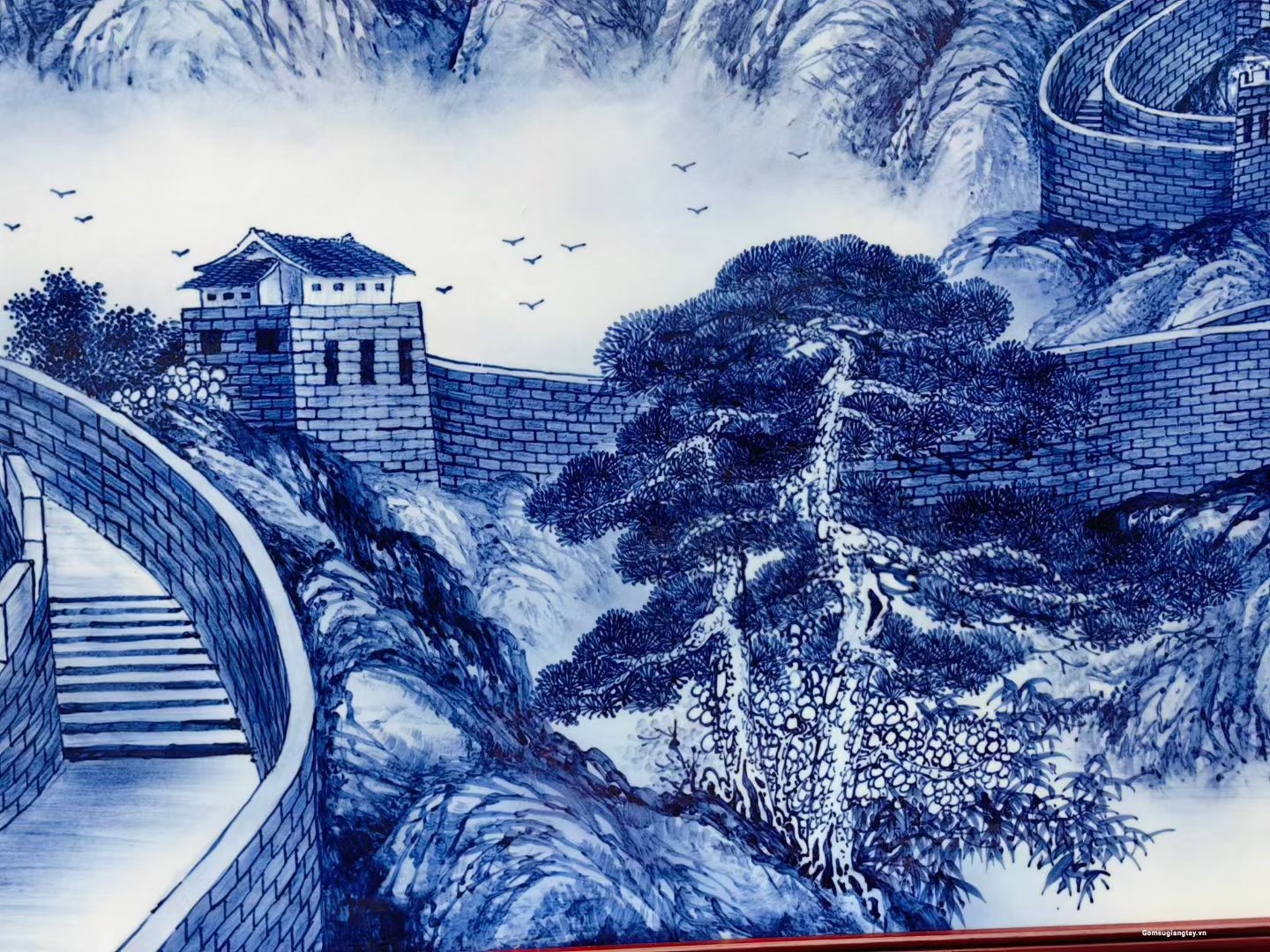 tranh vẽ tay hàng cao cấp của nghệ nhân có cấp sổ nghệ nhân, vẽ bồng lai tiên cảnh, sơn thủy hữu tình, điểm nhấn là Vạn lý Trường Thành, nét vẽ tơ tóc có hồn từ nhánh cây từ mây bồng bềnh đều được các nghệ nhân tỉa tót tỉ mỉ rất công phu, chanh được nung với nhiệt độ cao 1.800 ° và nung đến ba lần lửa nên rất bền đẹp.