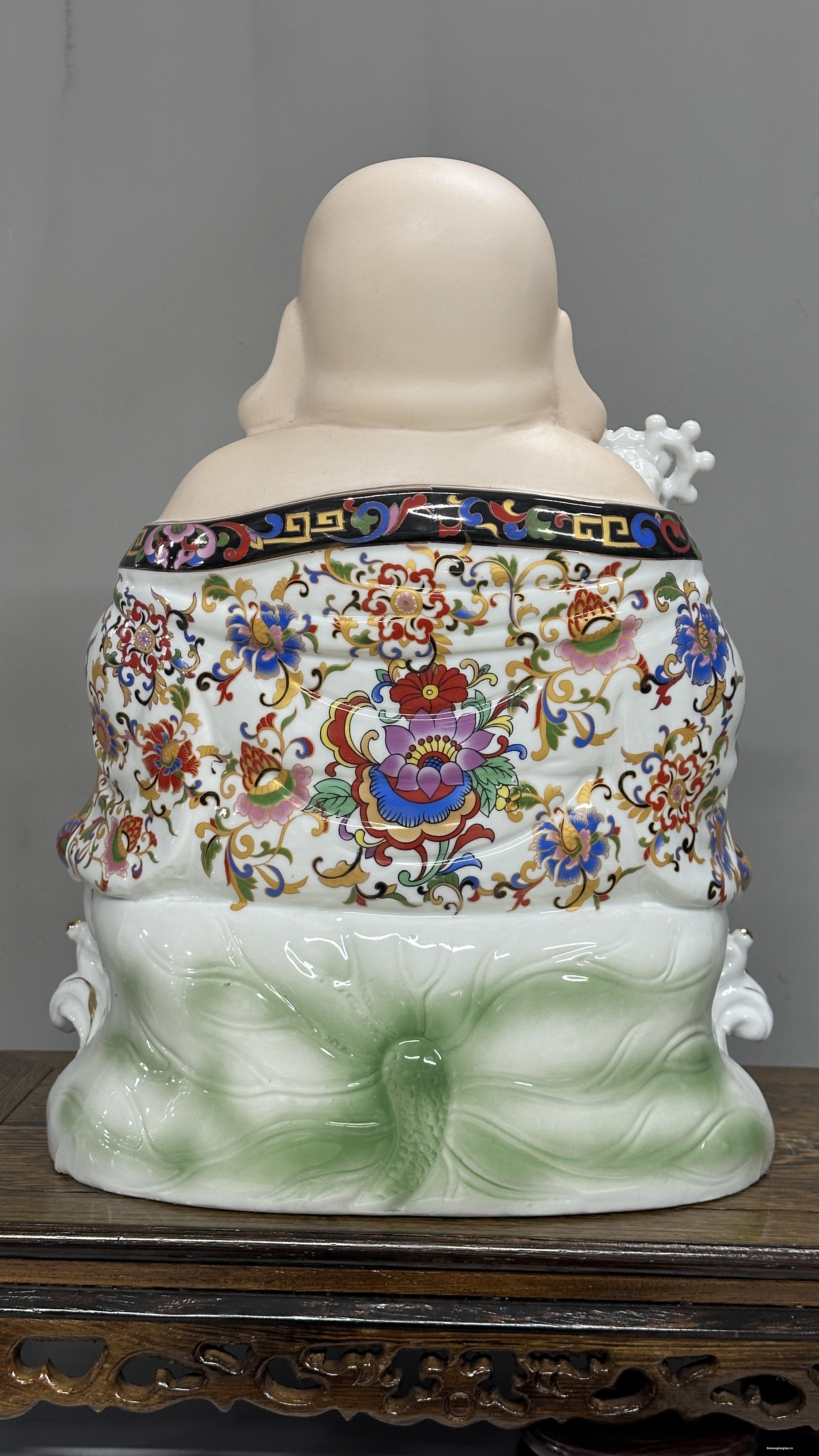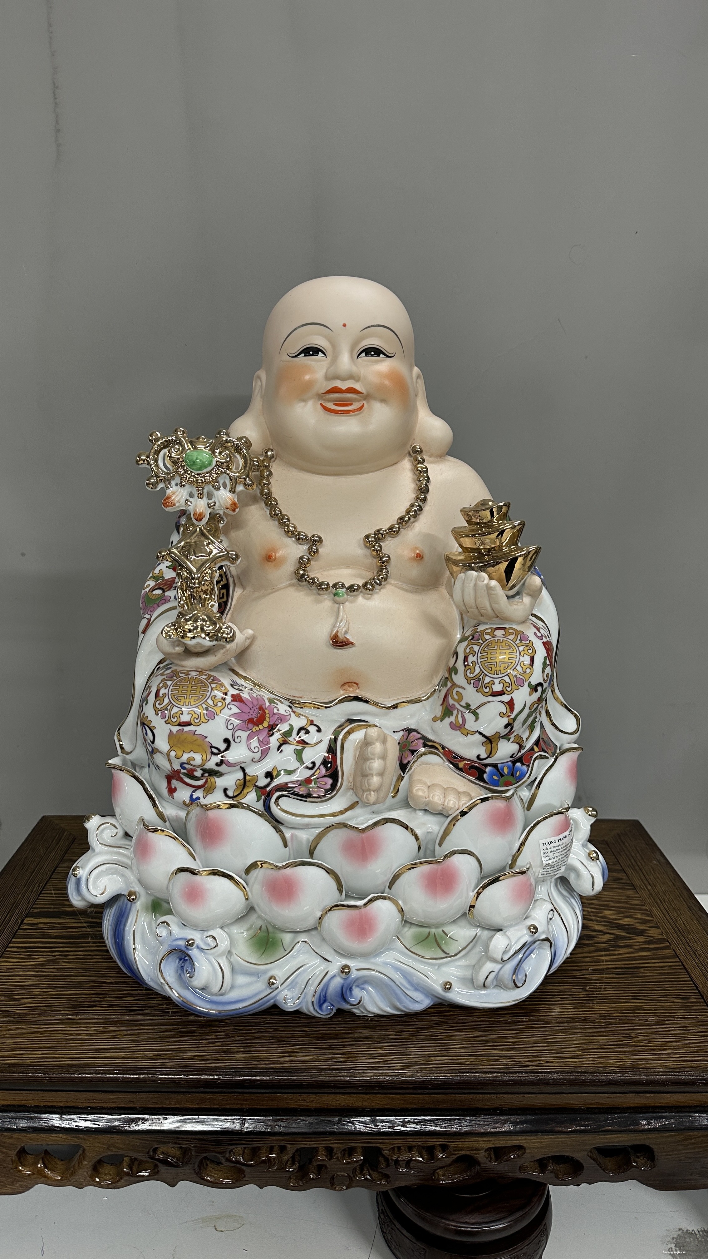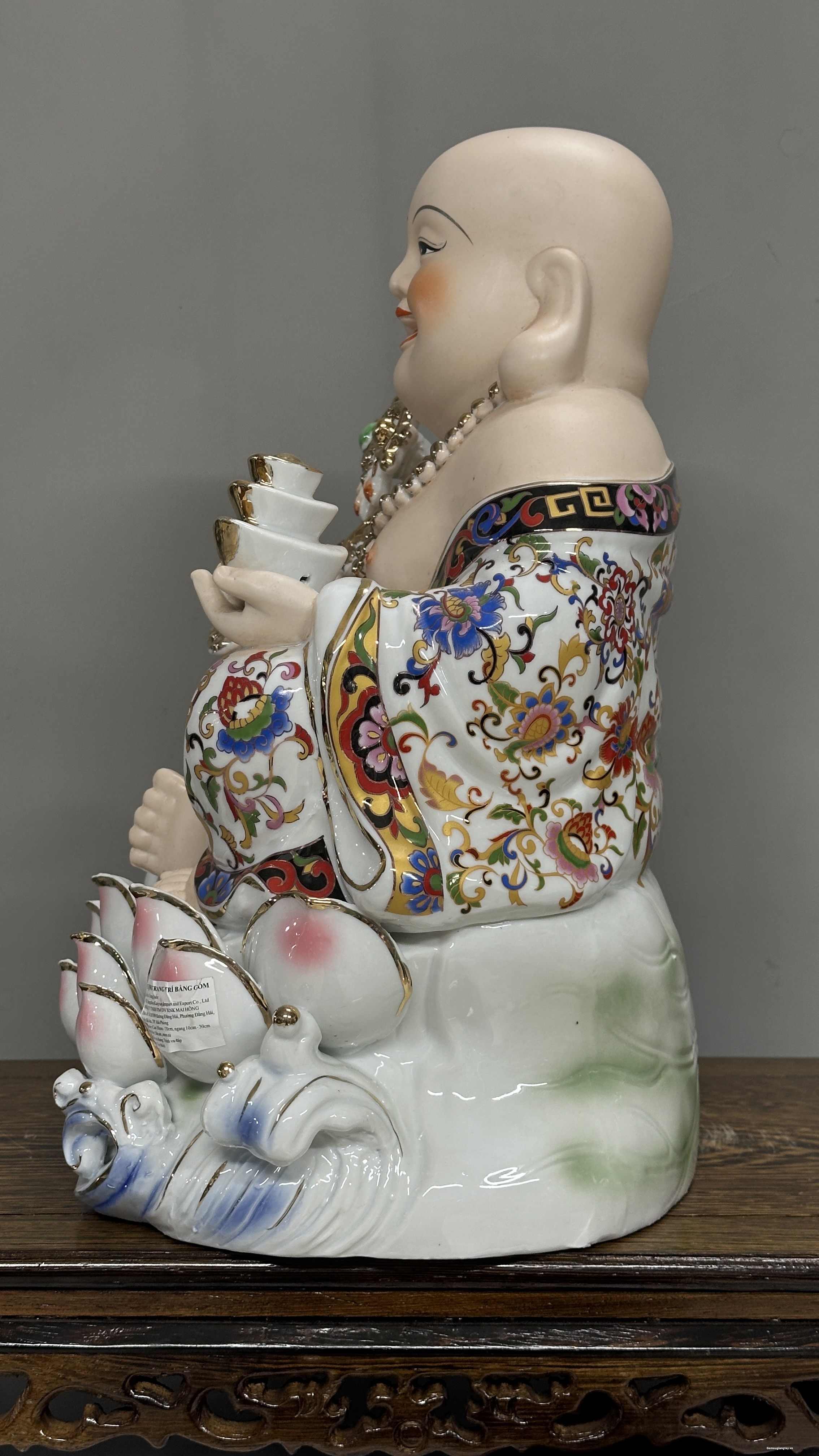 Tượng di lặc cụ ngồi đài sen rất bề thế, rất đẹp được nung với nhiệt độ cao cực kỳ bền.