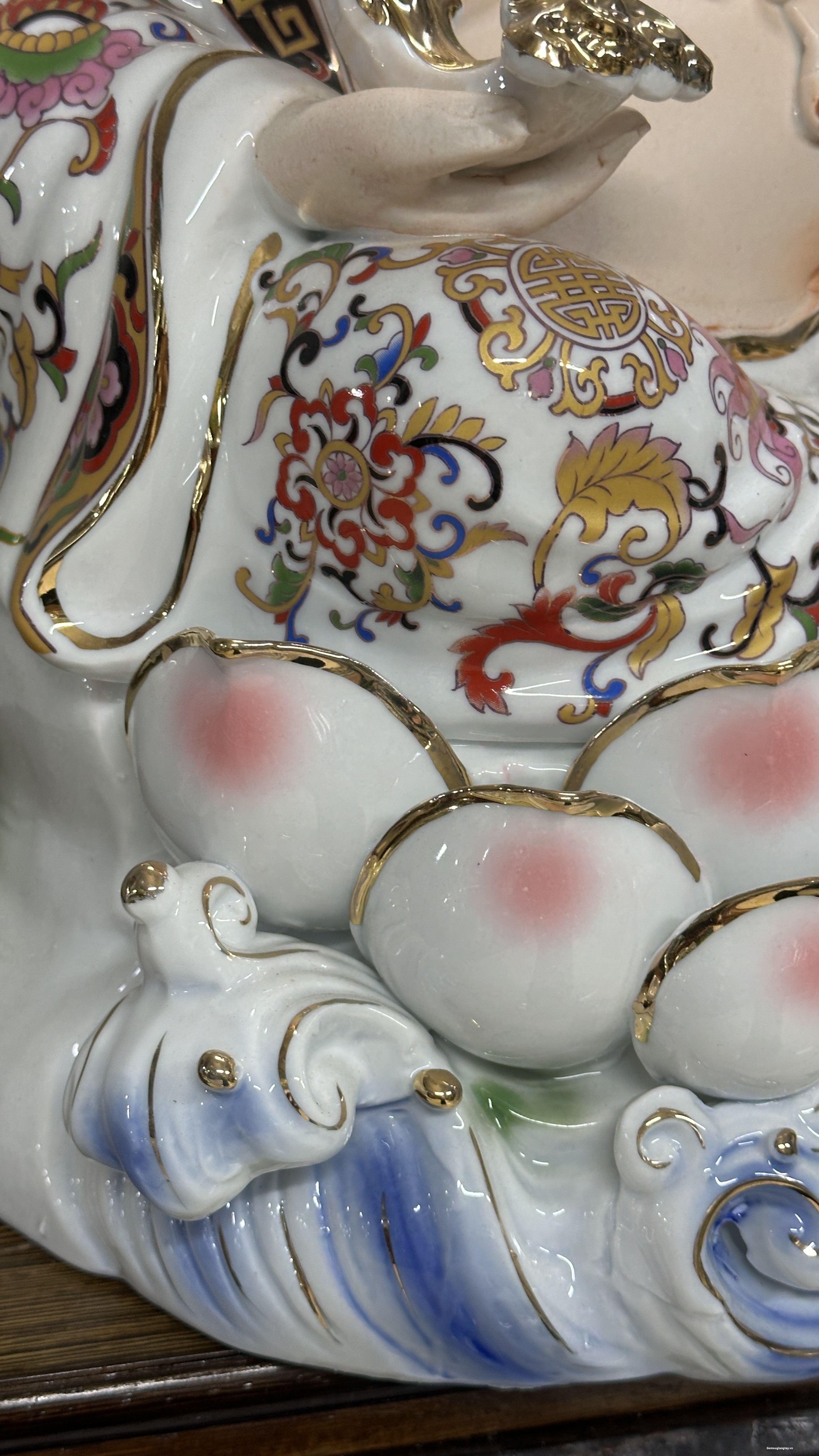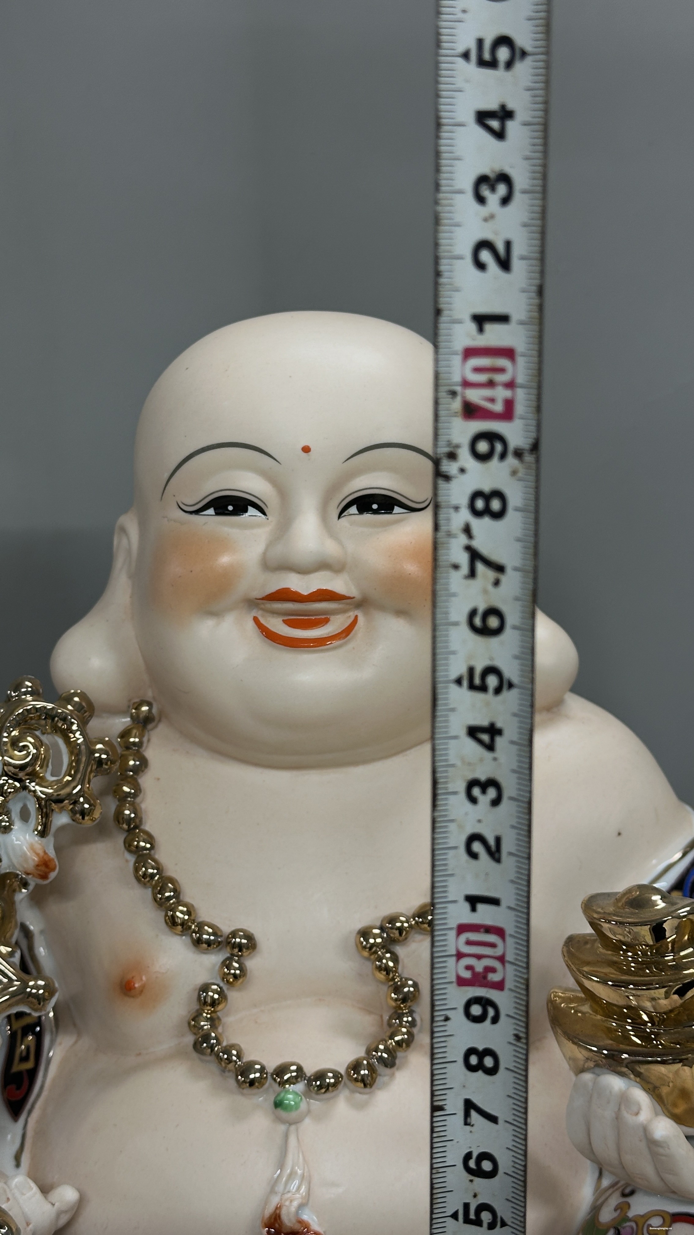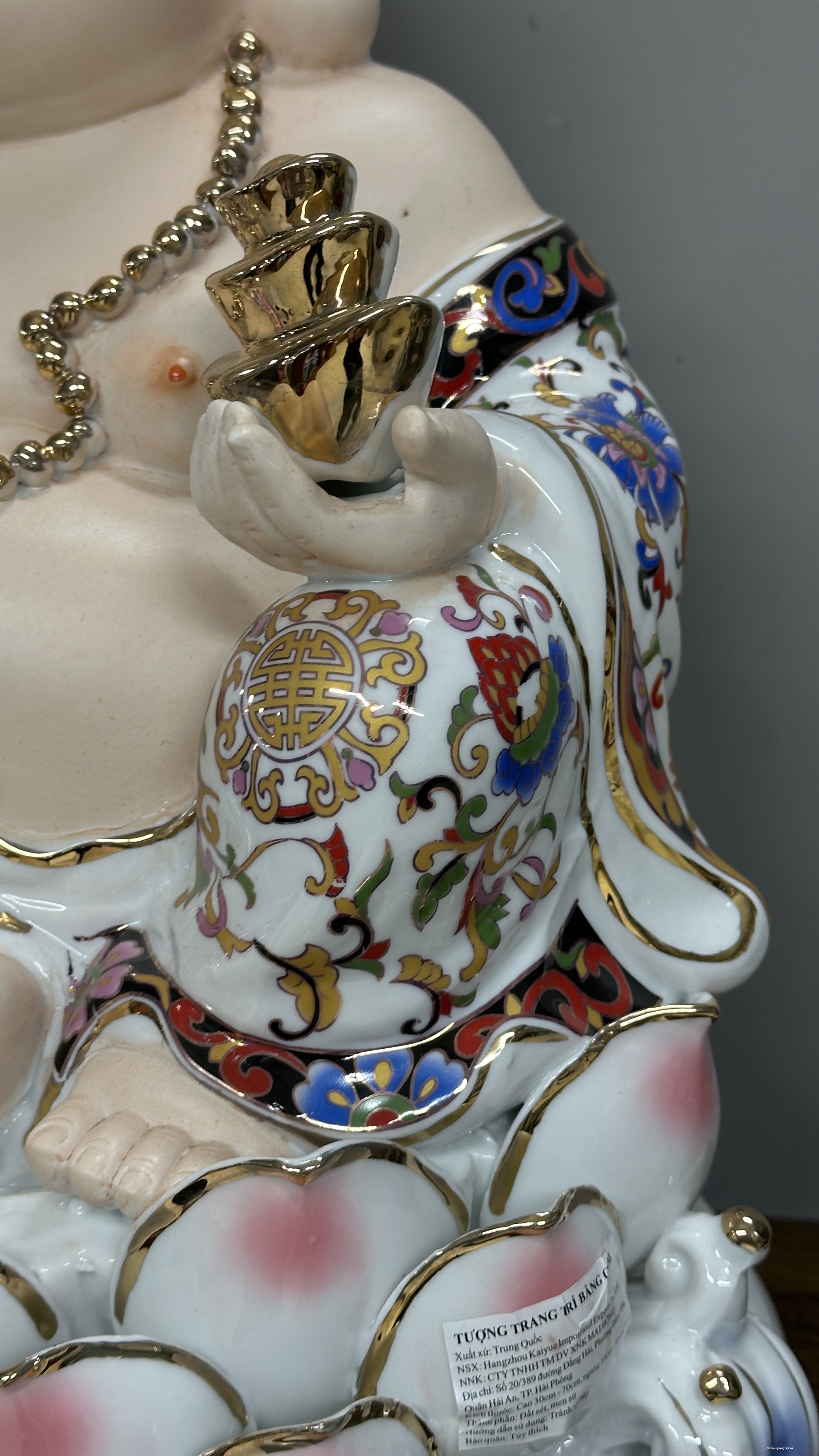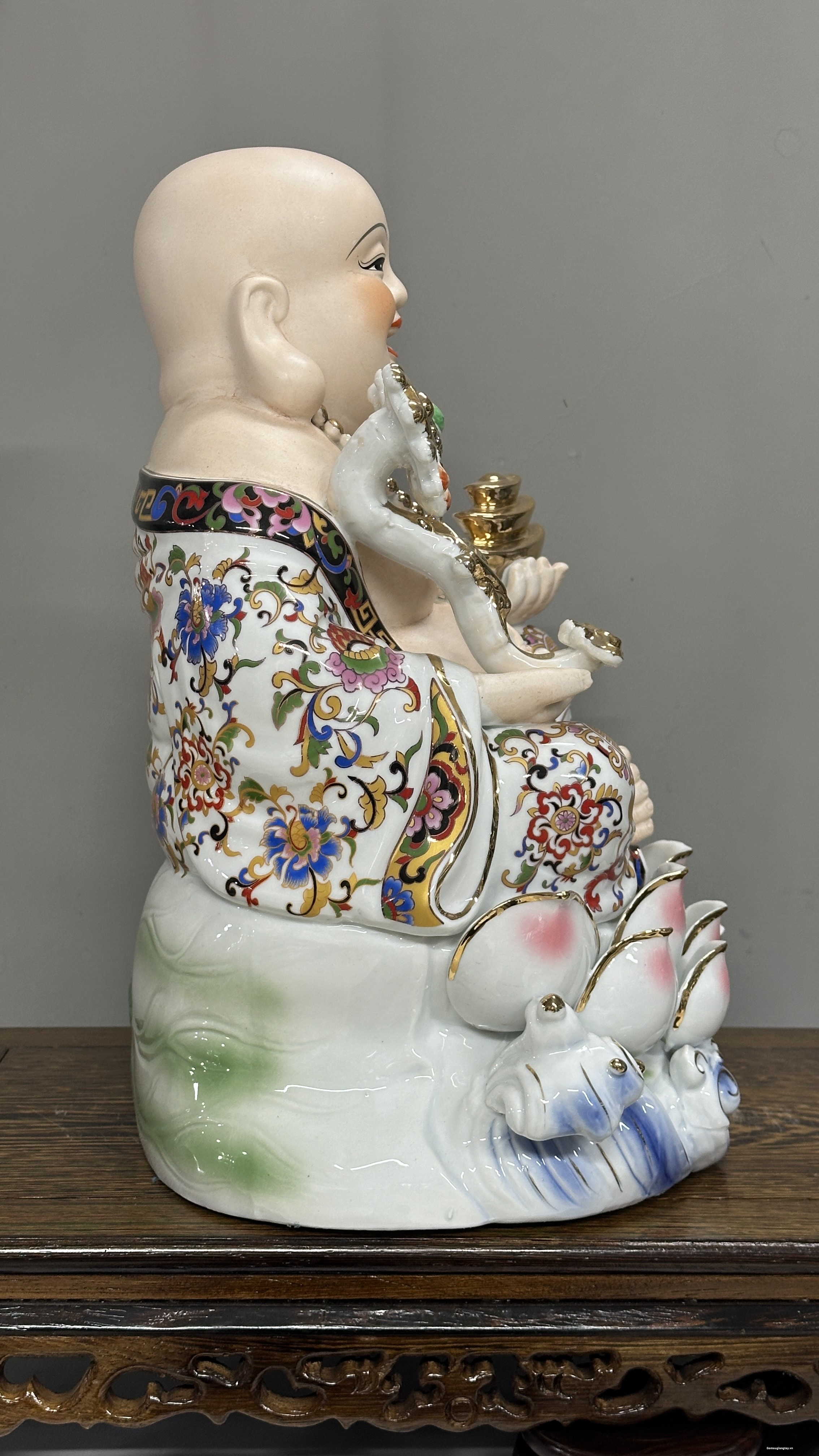 Tượng di lặc cụ ngồi đài sen rất bề thế, rất đẹp được nung với nhiệt độ cao cực kỳ bền.