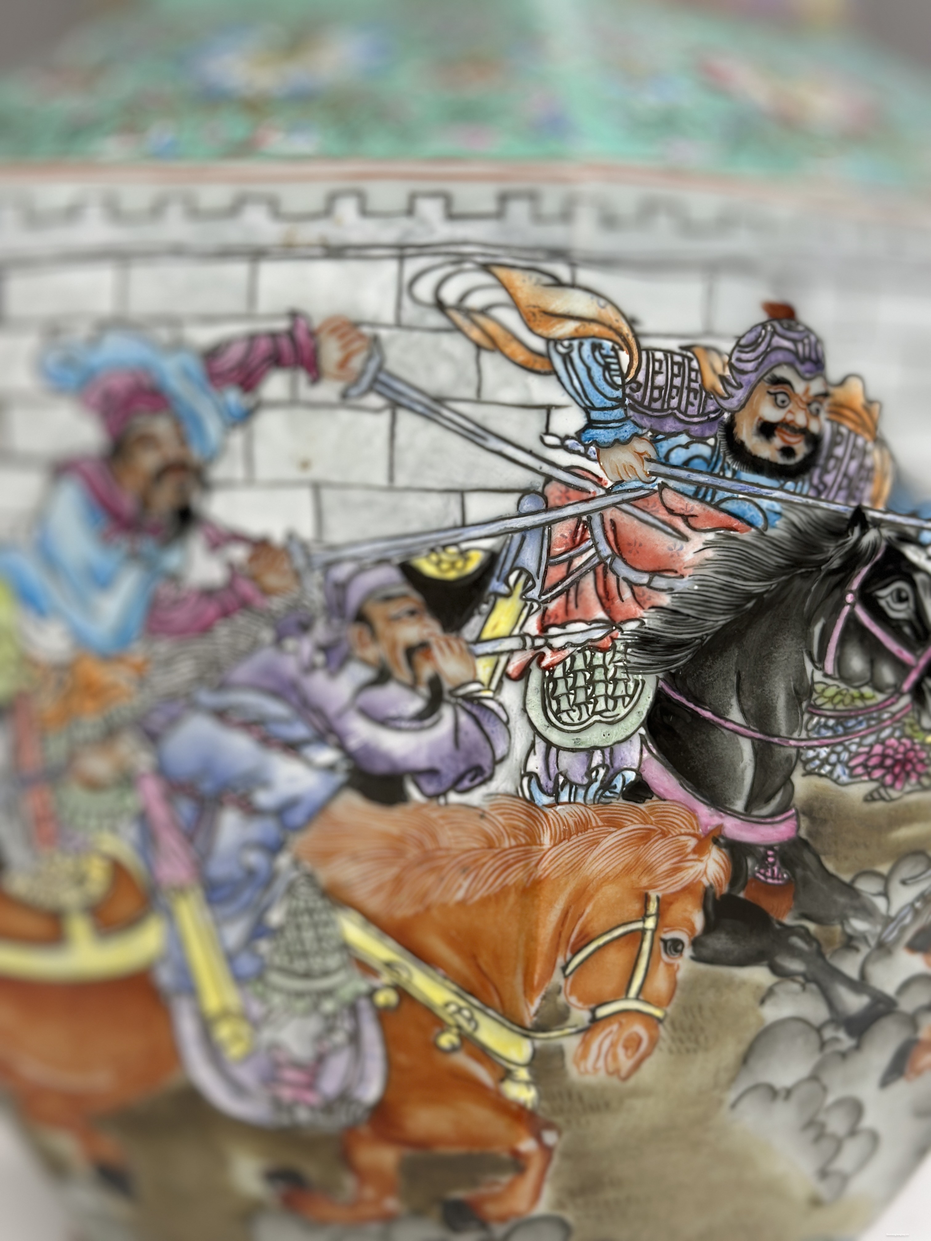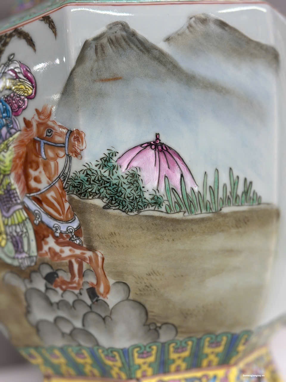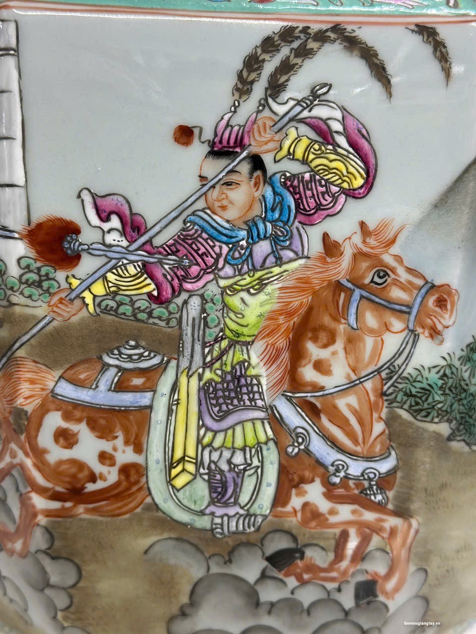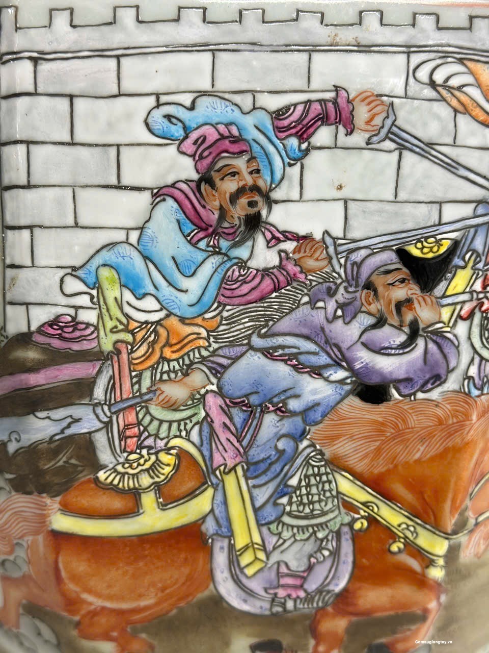 Đôi gấm vô cùng đẹp tích “Tam Anh chiến Lã Bố” vẽ tay 100%, họa tiết chi tiết vẽ tơ tóc từ cái lá cây, từ khuôn mặt của mỗi nhân vật rất thần thái, mỗi một chi tiết nhỏ đều được dùng kính lúp để vẽ, đồ siêu cấp khó làm phải là thợ lành nghề nung ba lần lửa thì mới ra được thành phẩm, những hàng siêu cấp này nung 10 cái may ra chọn được hai cái nên rất quý hiếm.