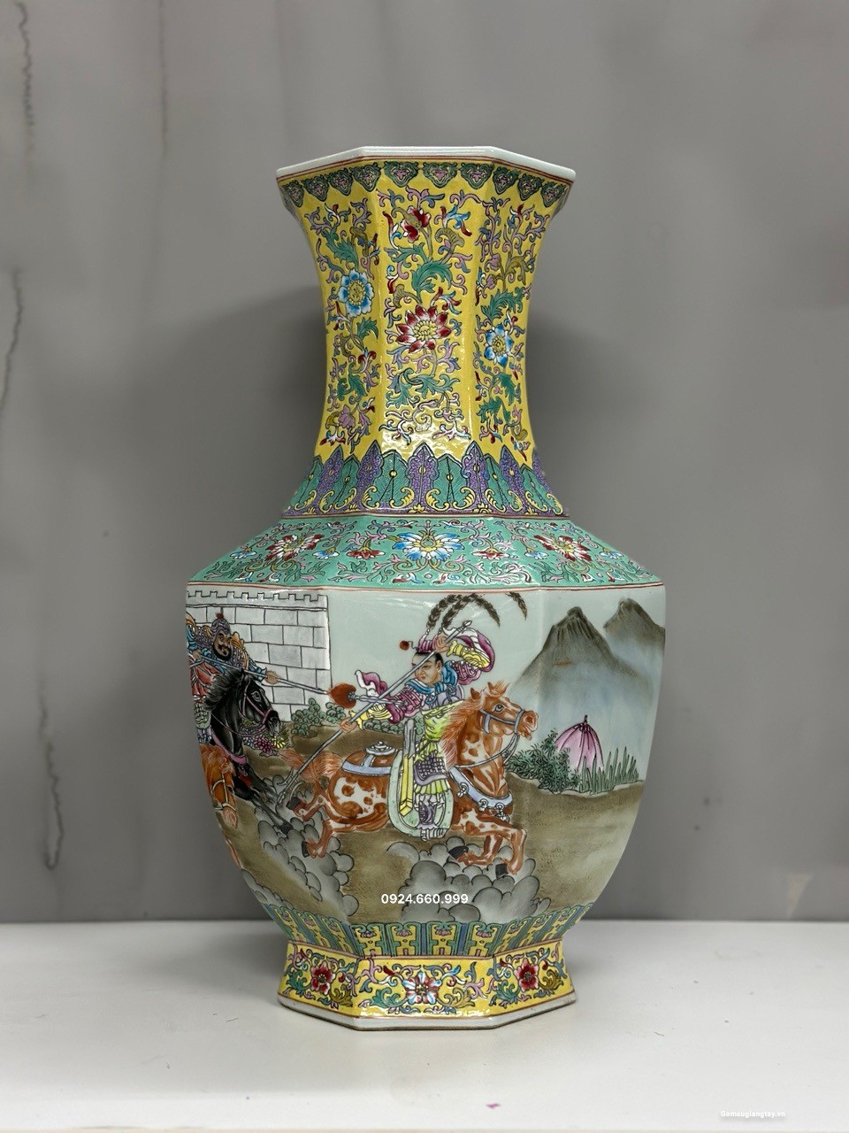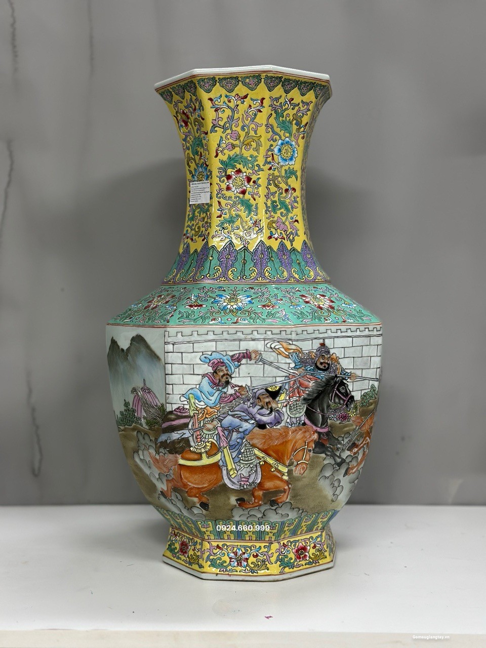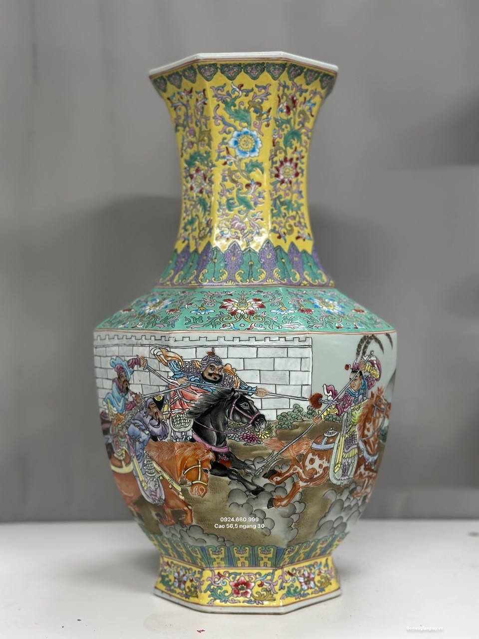 Đôi gấm vô cùng đẹp tích “Tam Anh chiến Lã Bố” vẽ tay 100%, họa tiết chi tiết vẽ tơ tóc từ cái lá cây, từ khuôn mặt của mỗi nhân vật rất thần thái, mỗi một chi tiết nhỏ đều được dùng kính lúp để vẽ, đồ siêu cấp khó làm phải là thợ lành nghề nung ba lần lửa thì mới ra được thành phẩm, những hàng siêu cấp này nung 10 cái may ra chọn được hai cái nên rất quý hiếm.