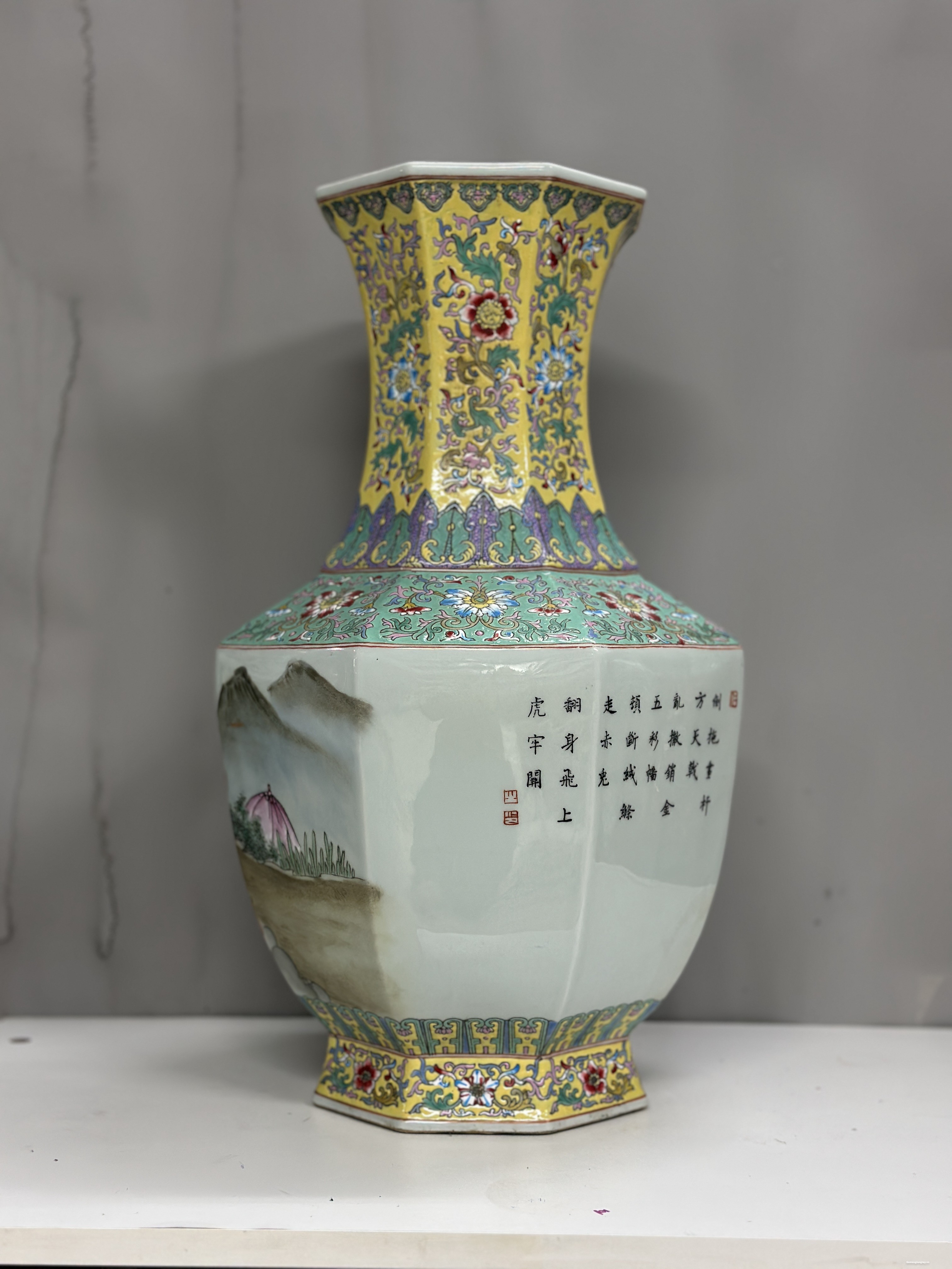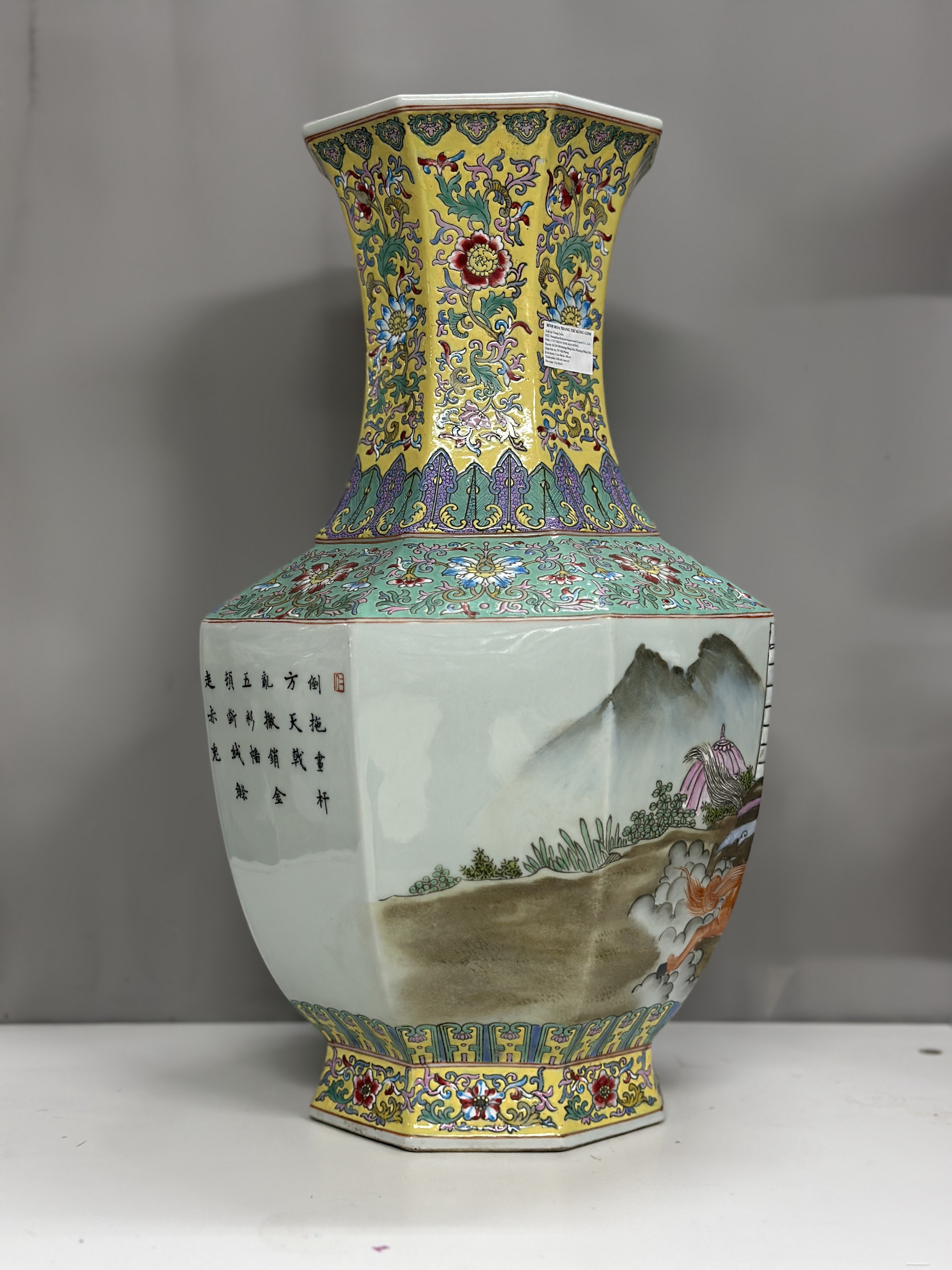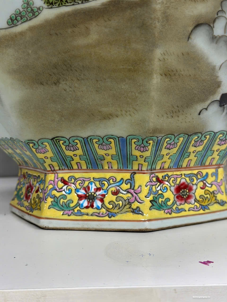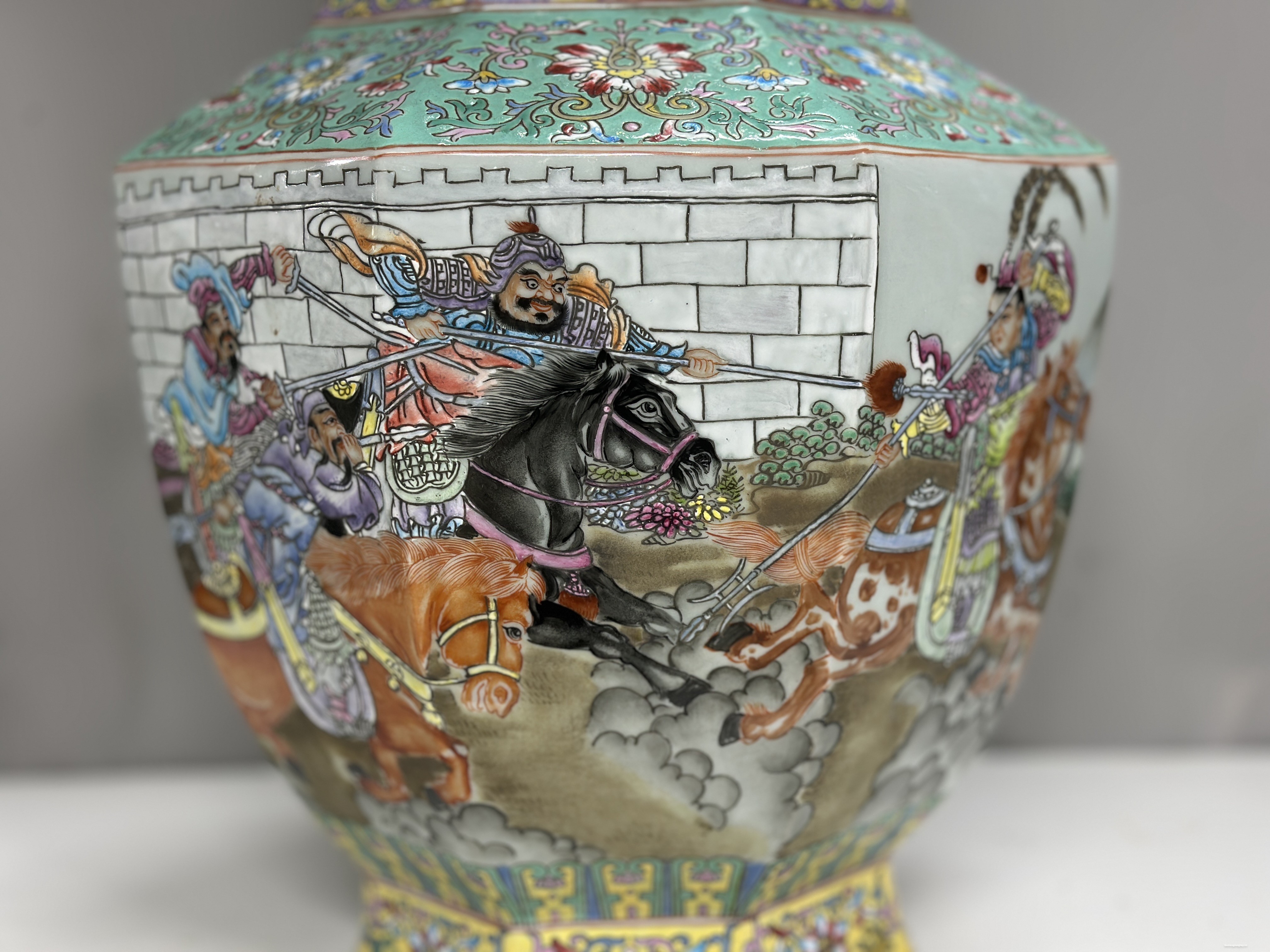 Đôi gấm vô cùng đẹp tích “Tam Anh chiến Lã Bố” vẽ tay 100%, họa tiết chi tiết vẽ tơ tóc từ cái lá cây, từ khuôn mặt của mỗi nhân vật rất thần thái, mỗi một chi tiết nhỏ đều được dùng kính lúp để vẽ, đồ siêu cấp khó làm phải là thợ lành nghề nung ba lần lửa thì mới ra được thành phẩm, những hàng siêu cấp này nung 10 cái may ra chọn được hai cái nên rất quý hiếm.