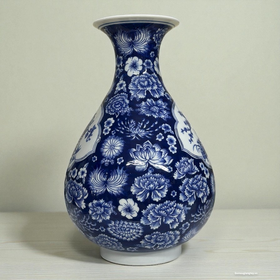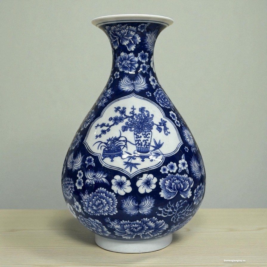 Bình dáng tỳ bà vẽ tay dạng vẽ băng mai điển tích cổ đồ họa rất sang trọng cổ kính, bình làm công phu men nung nhiệt độ 1800 ° 3 lần lửa.