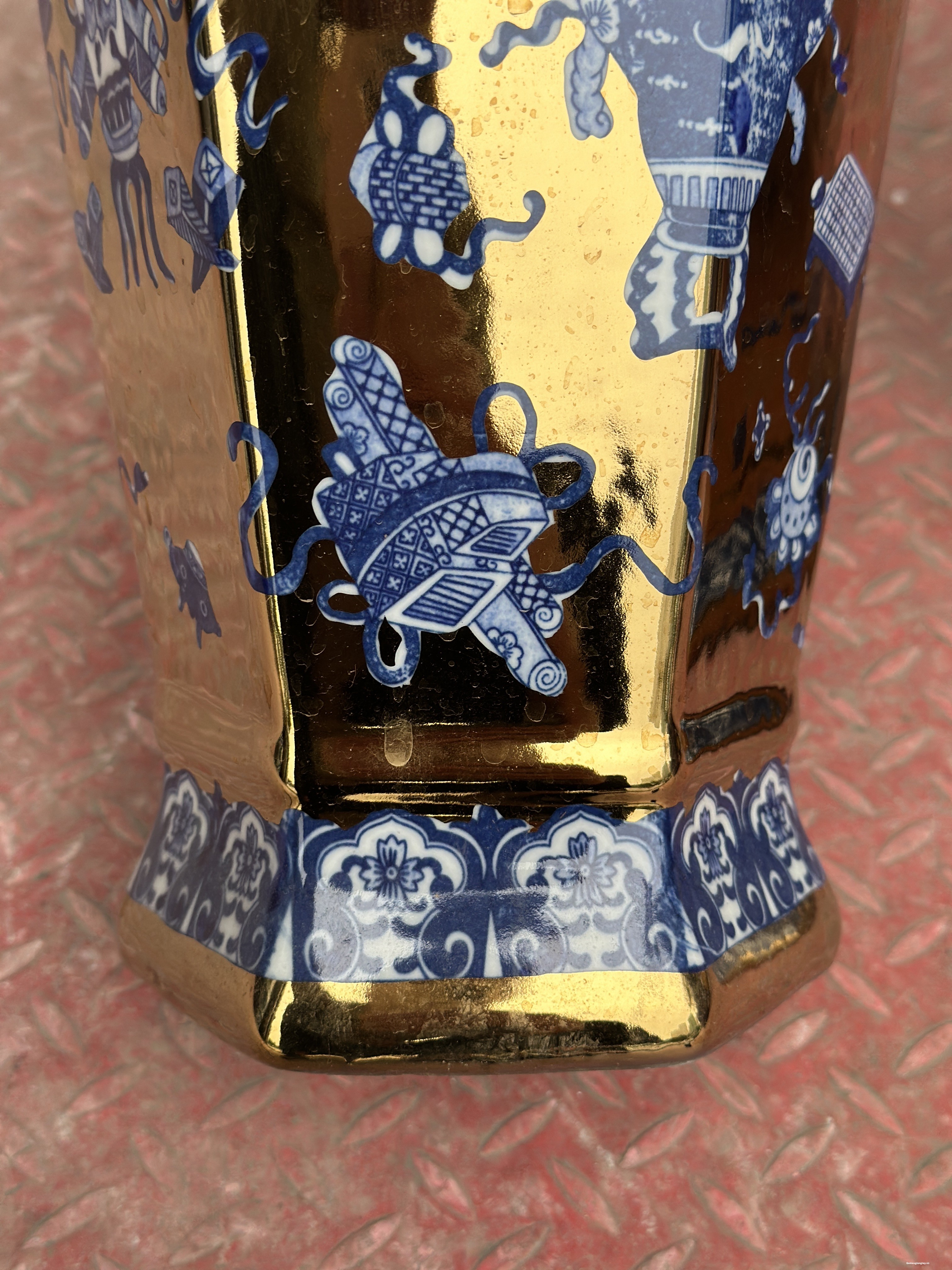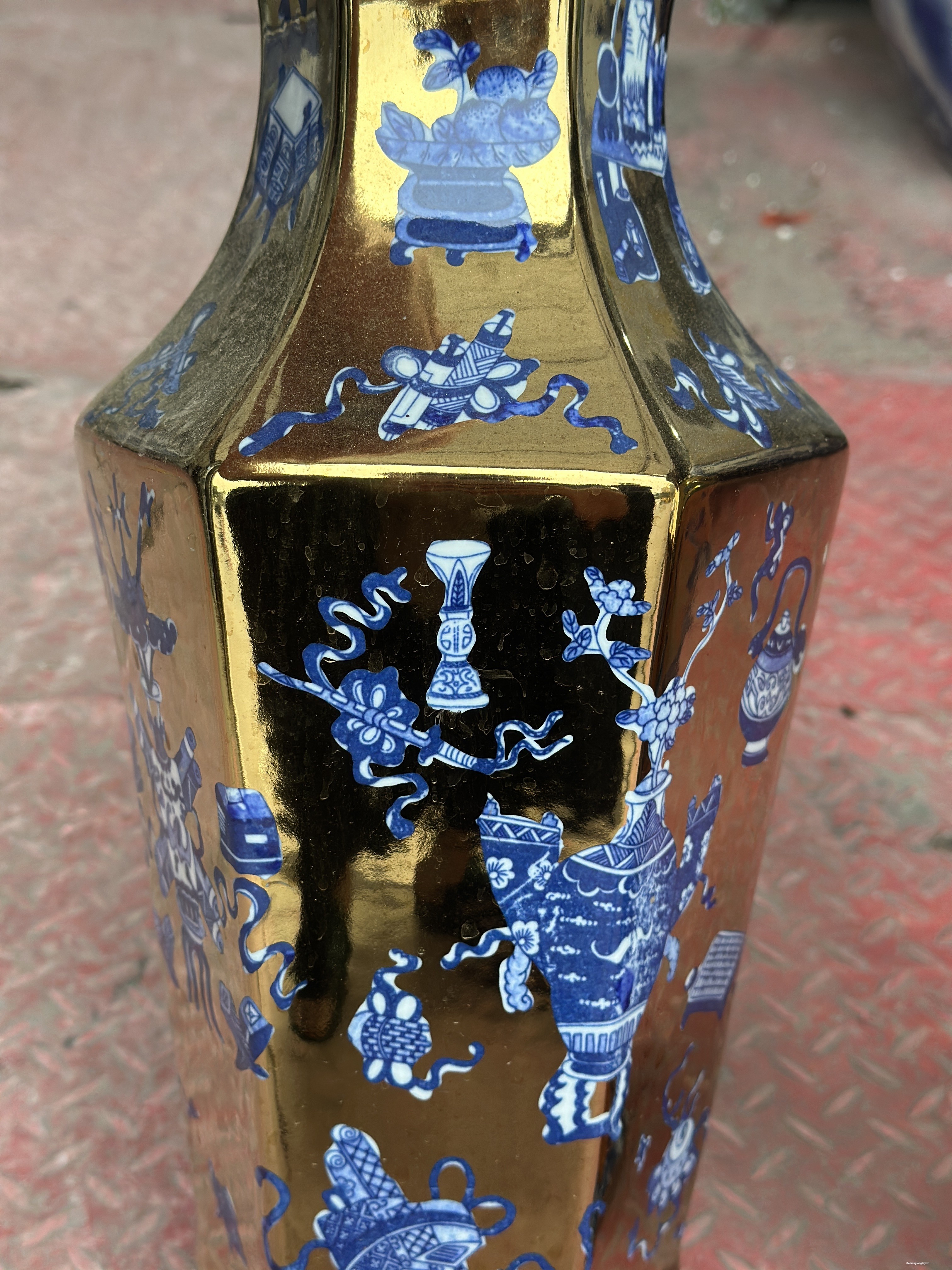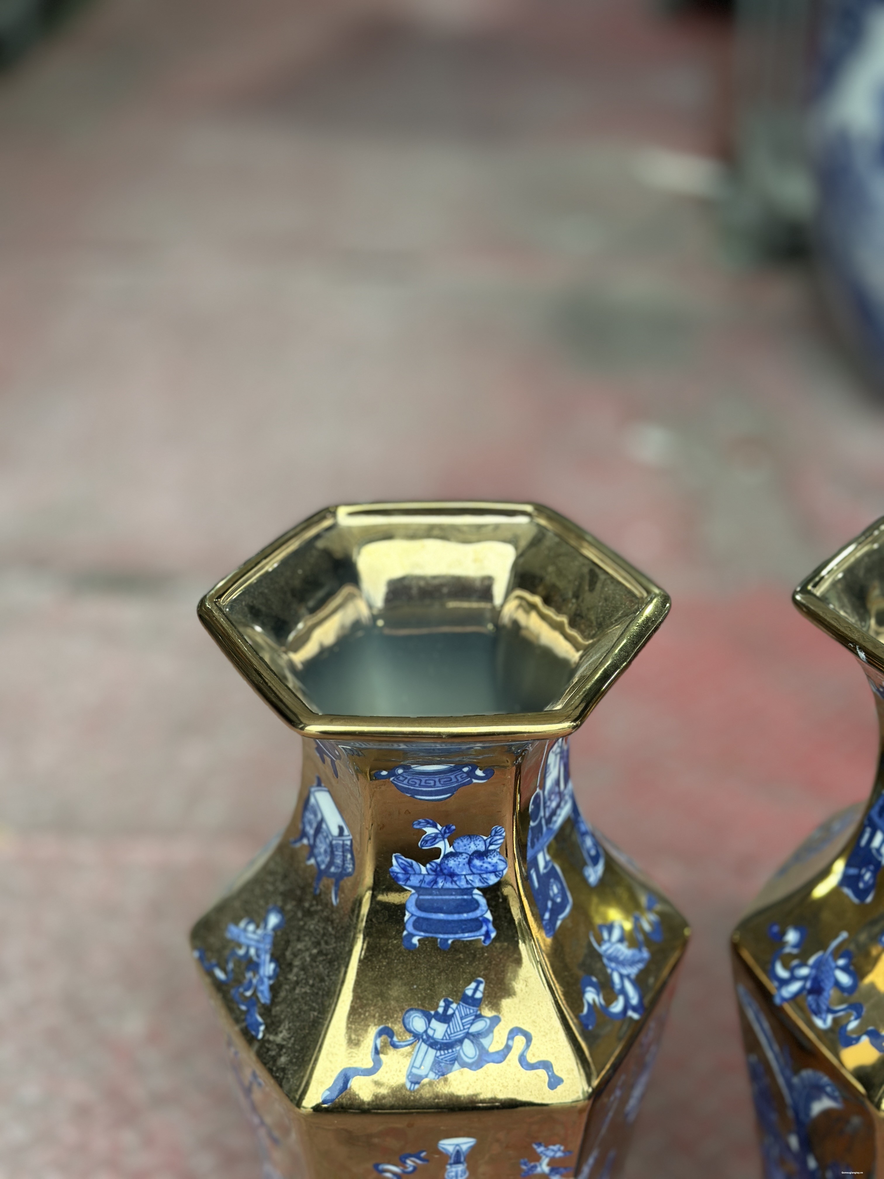 Đôi lục bình vẽ tay tích cổ đồ họa mạ vàng lục giác vô cùng đẹp, nhìn cổ kính sang trọng, dùng để trang trí trưng bày hoặc là để cắm hoa.