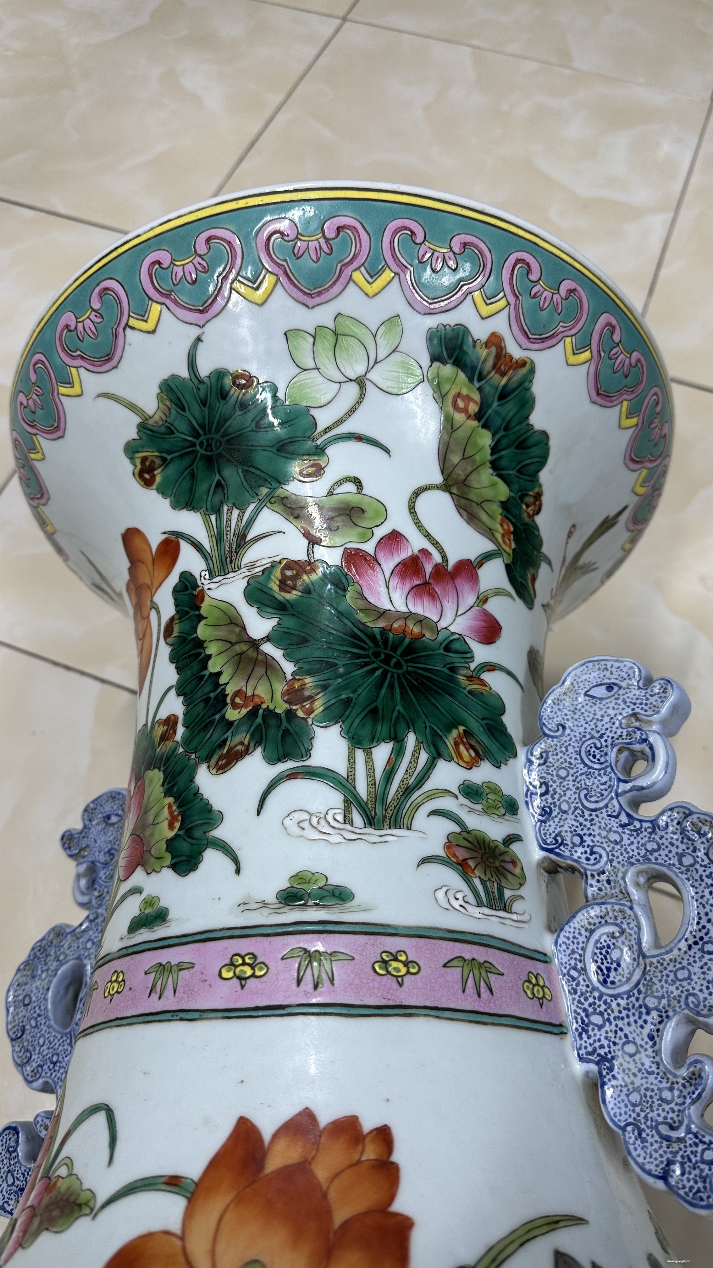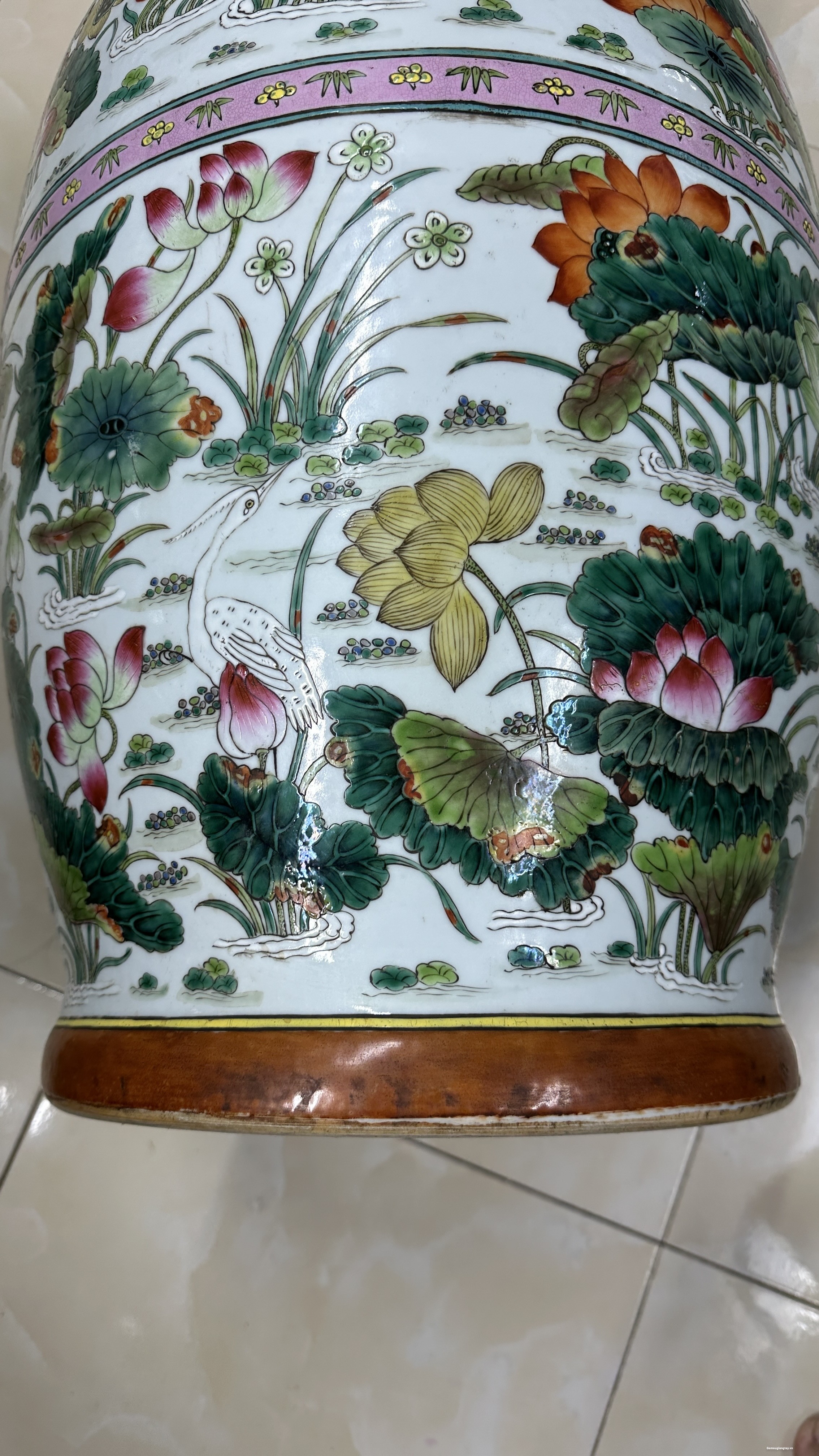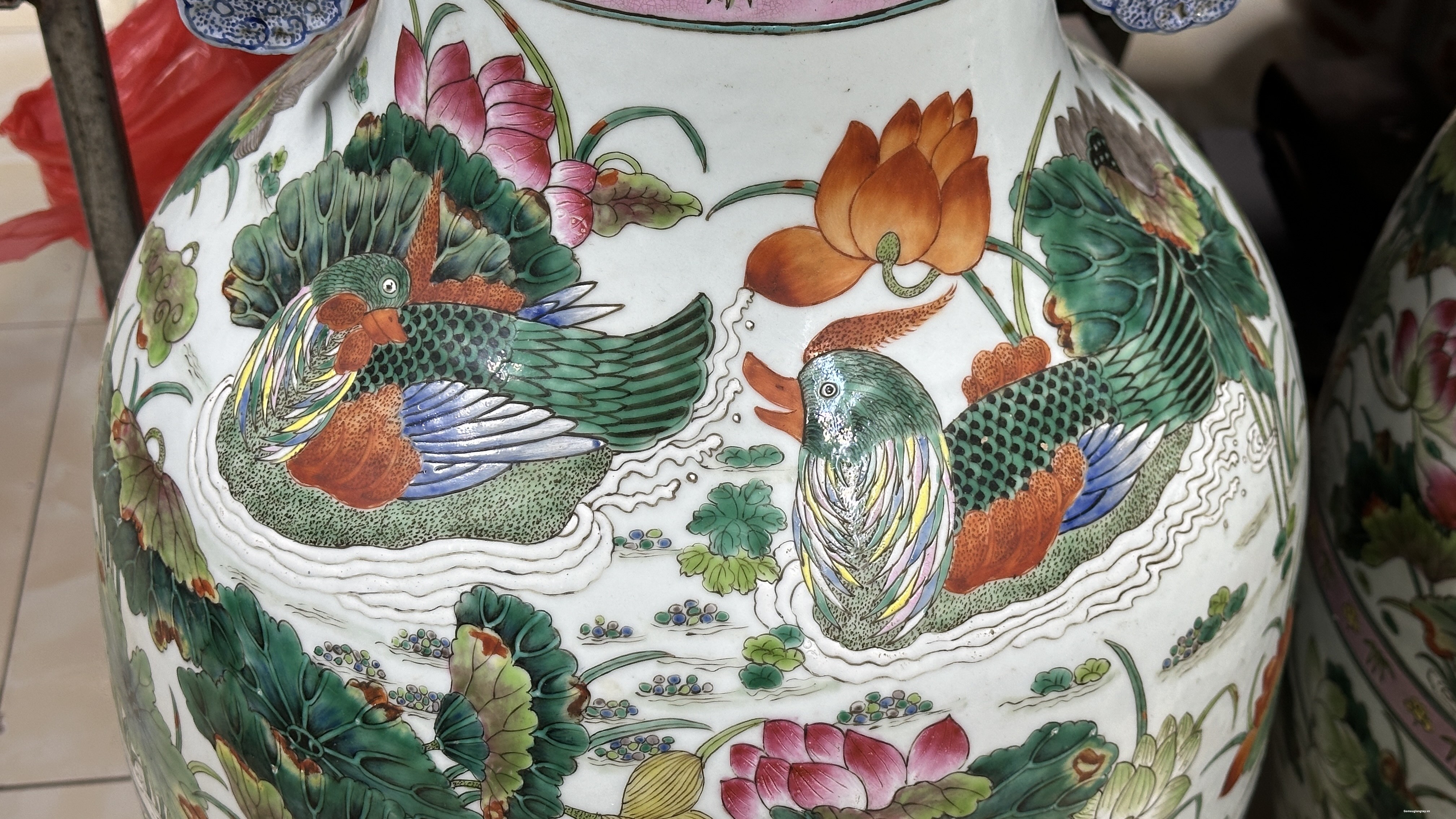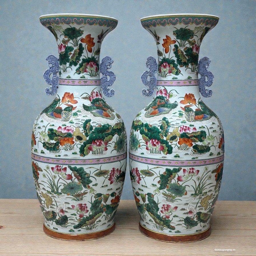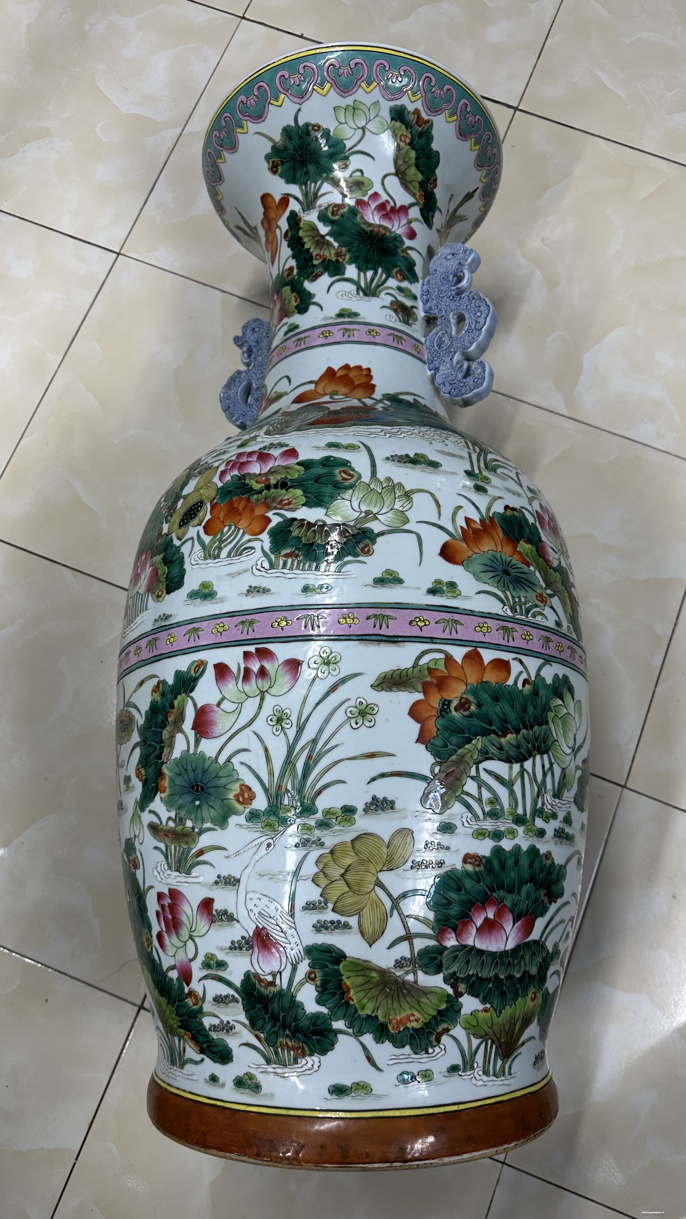 Đôi bình vẽ sen vịt Men màu cũ tơ tóc , vẽ tay nung củi hàng kỹ thuật cao, chôn và cốt khá già đồ, có tí tuổi thời gian tầm 50 , 60 năm.