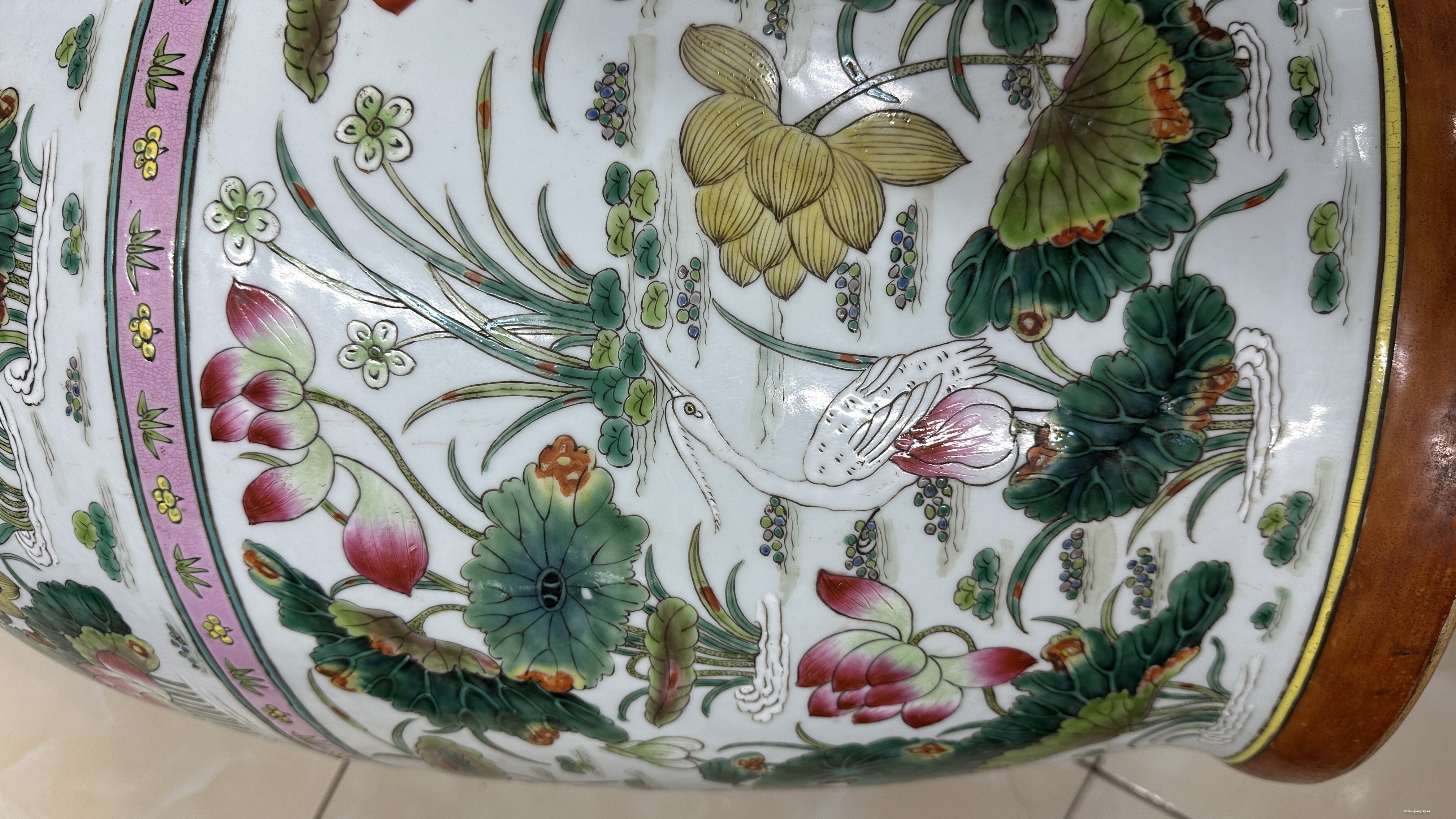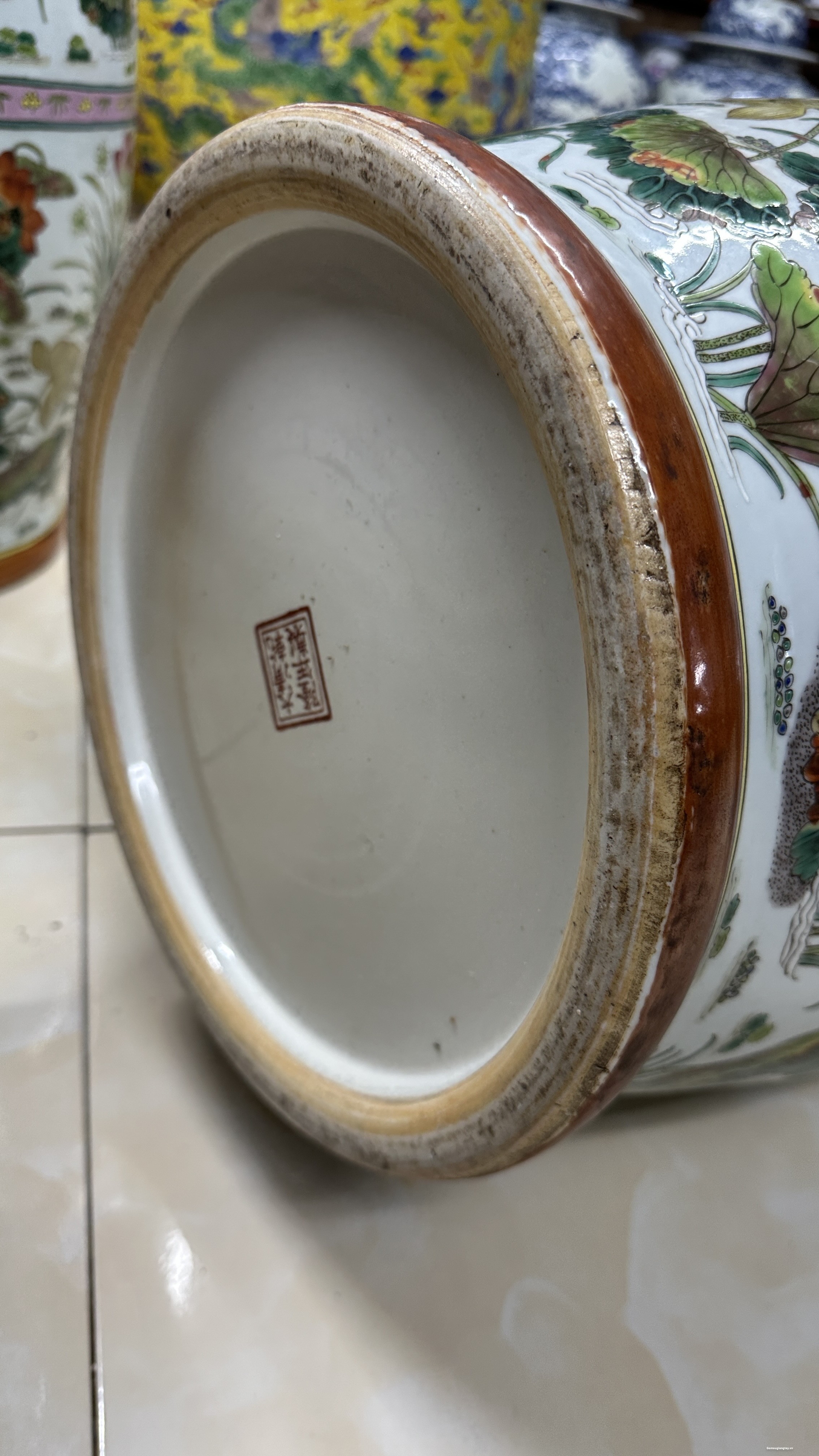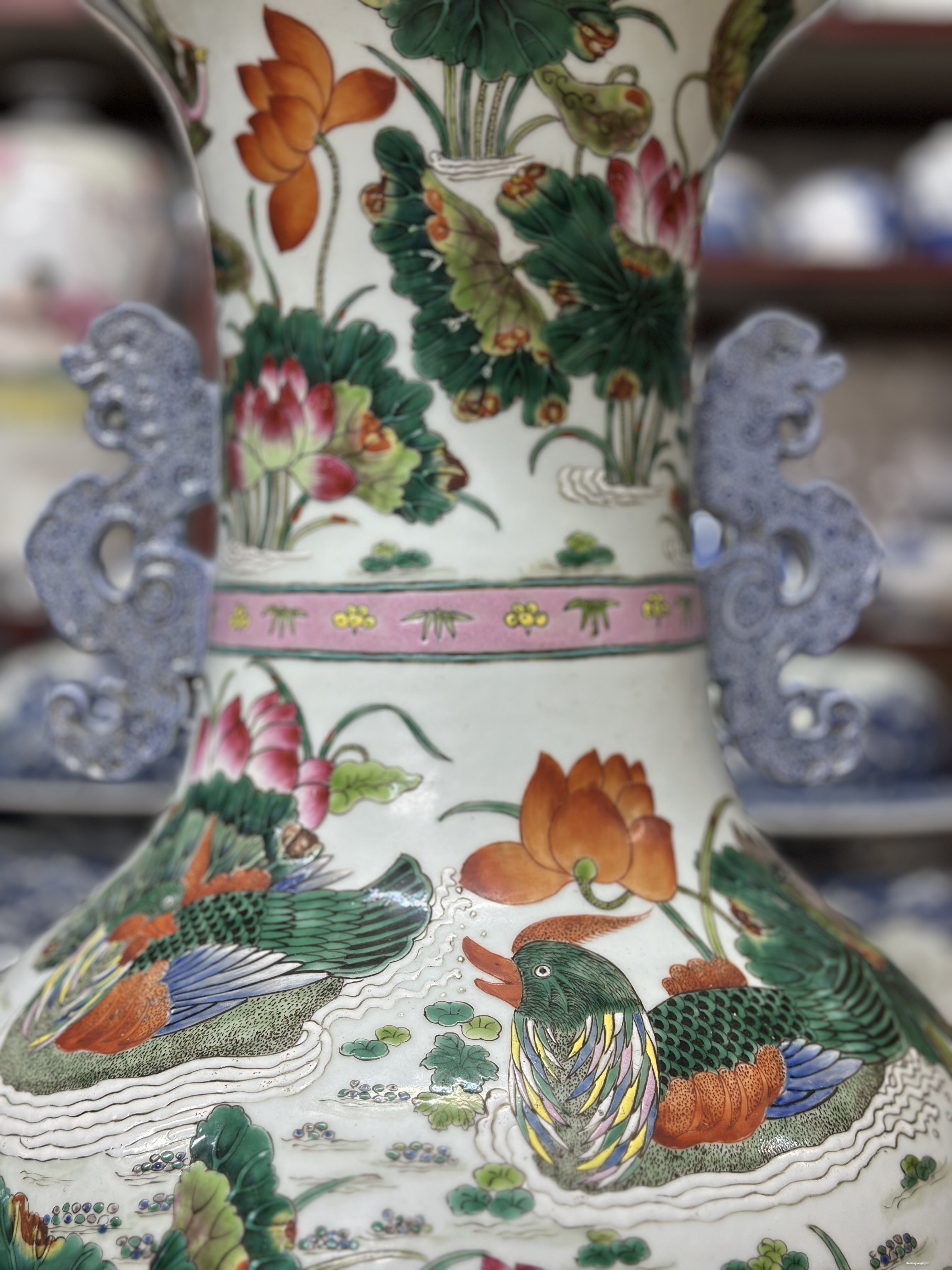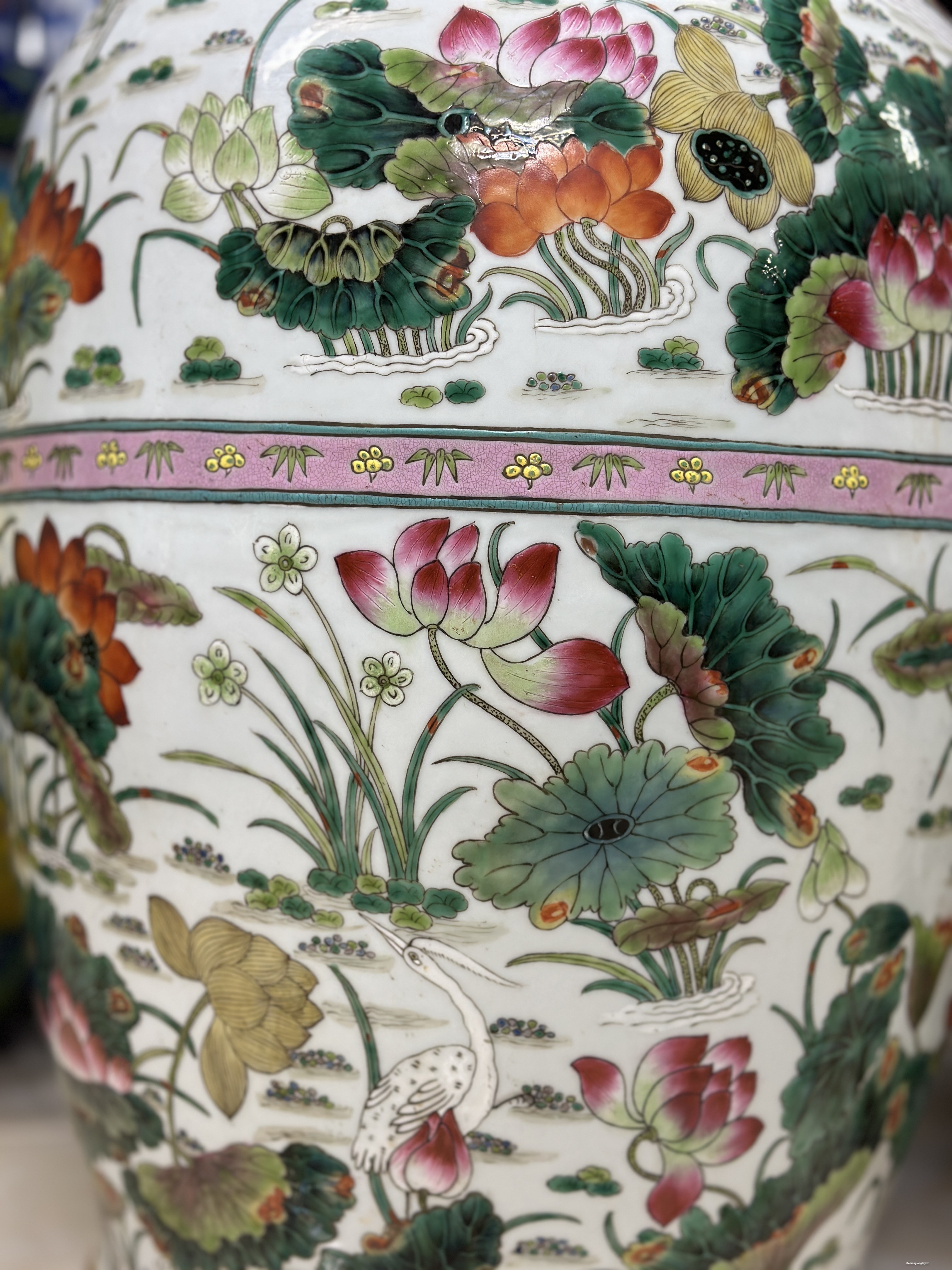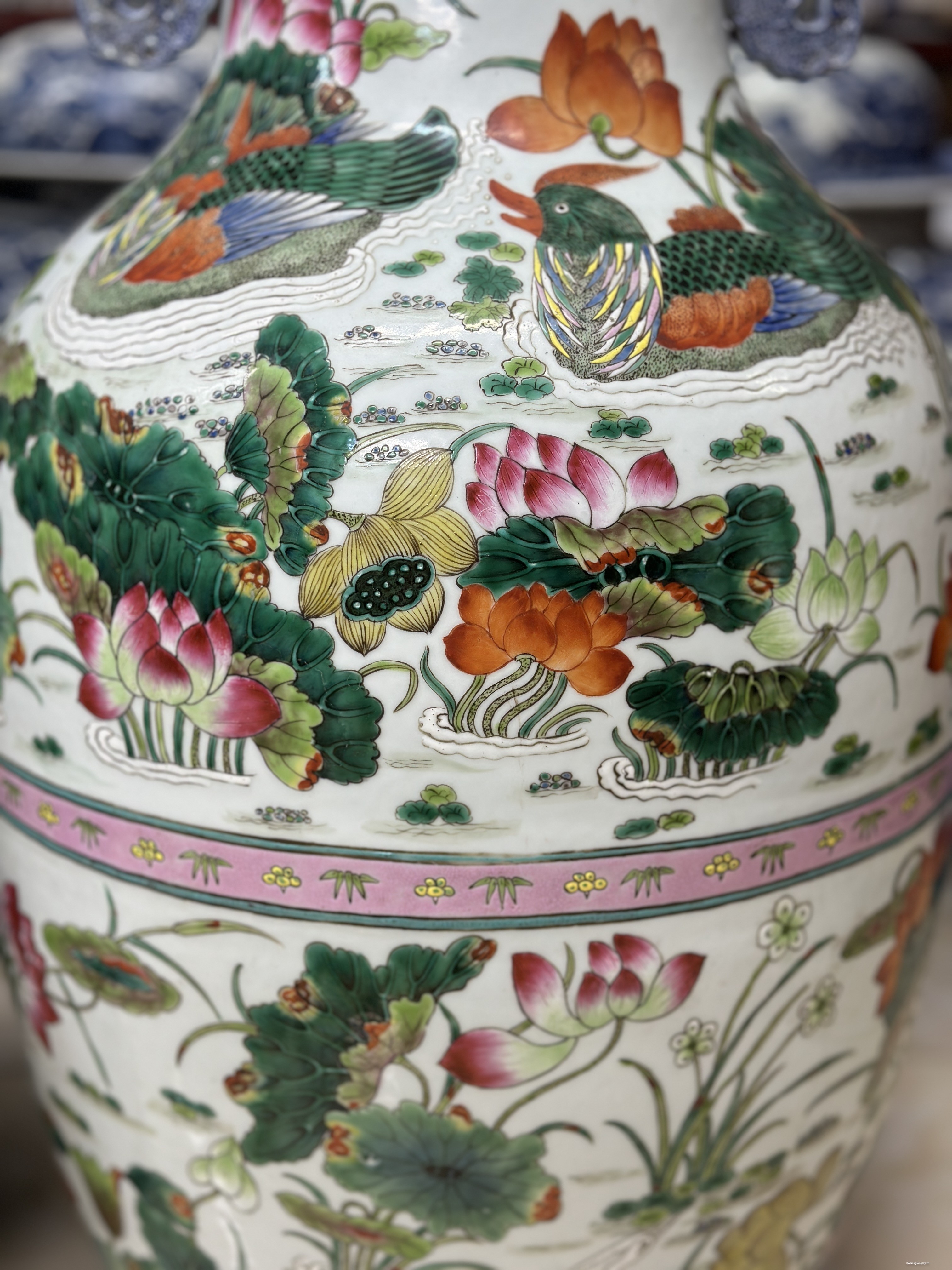 Đôi bình vẽ sen vịt Men màu cũ tơ tóc , vẽ tay nung củi hàng kỹ thuật cao, chôn và cốt khá già đồ, có tí tuổi thời gian tầm 50 , 60 năm.