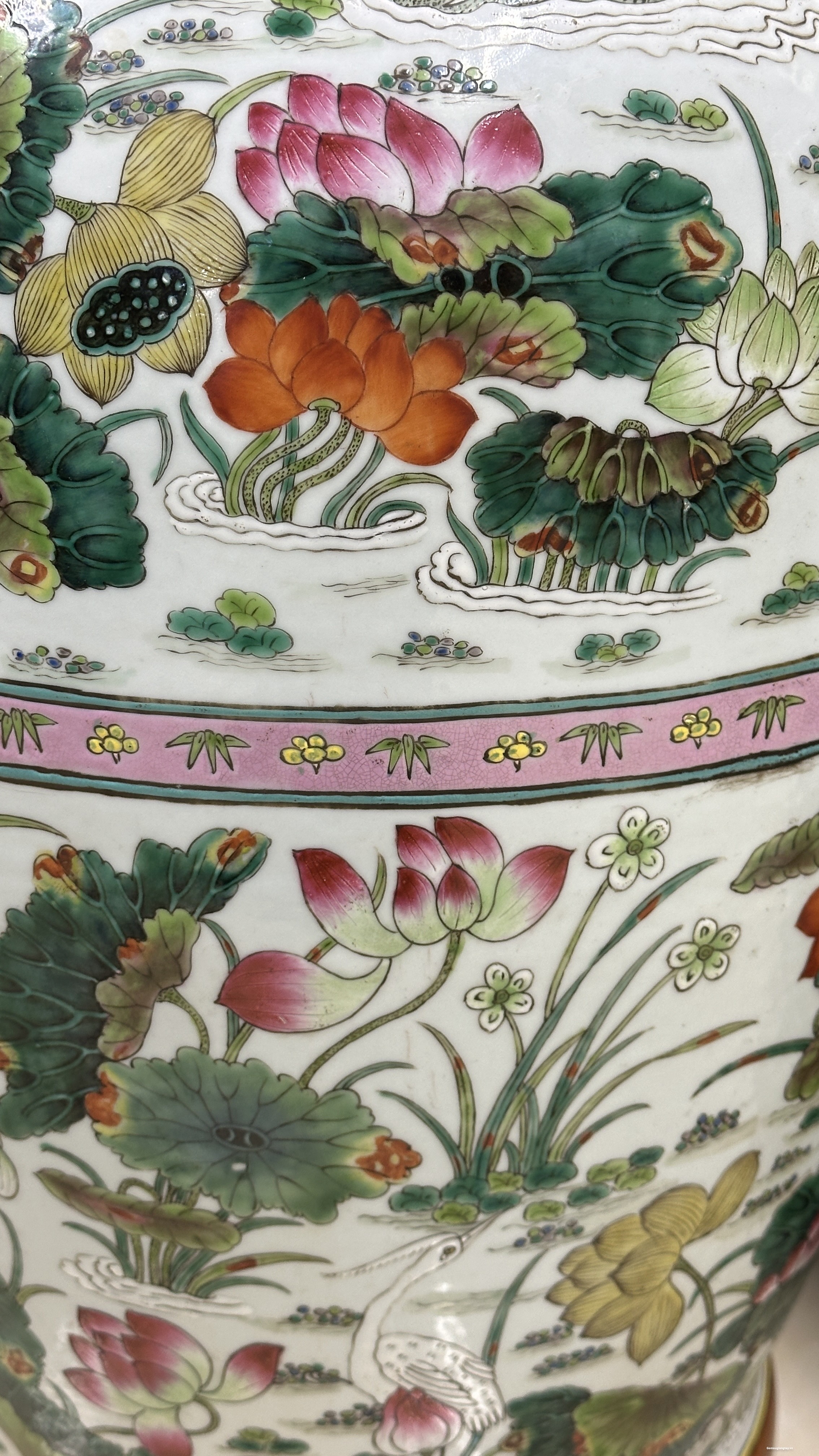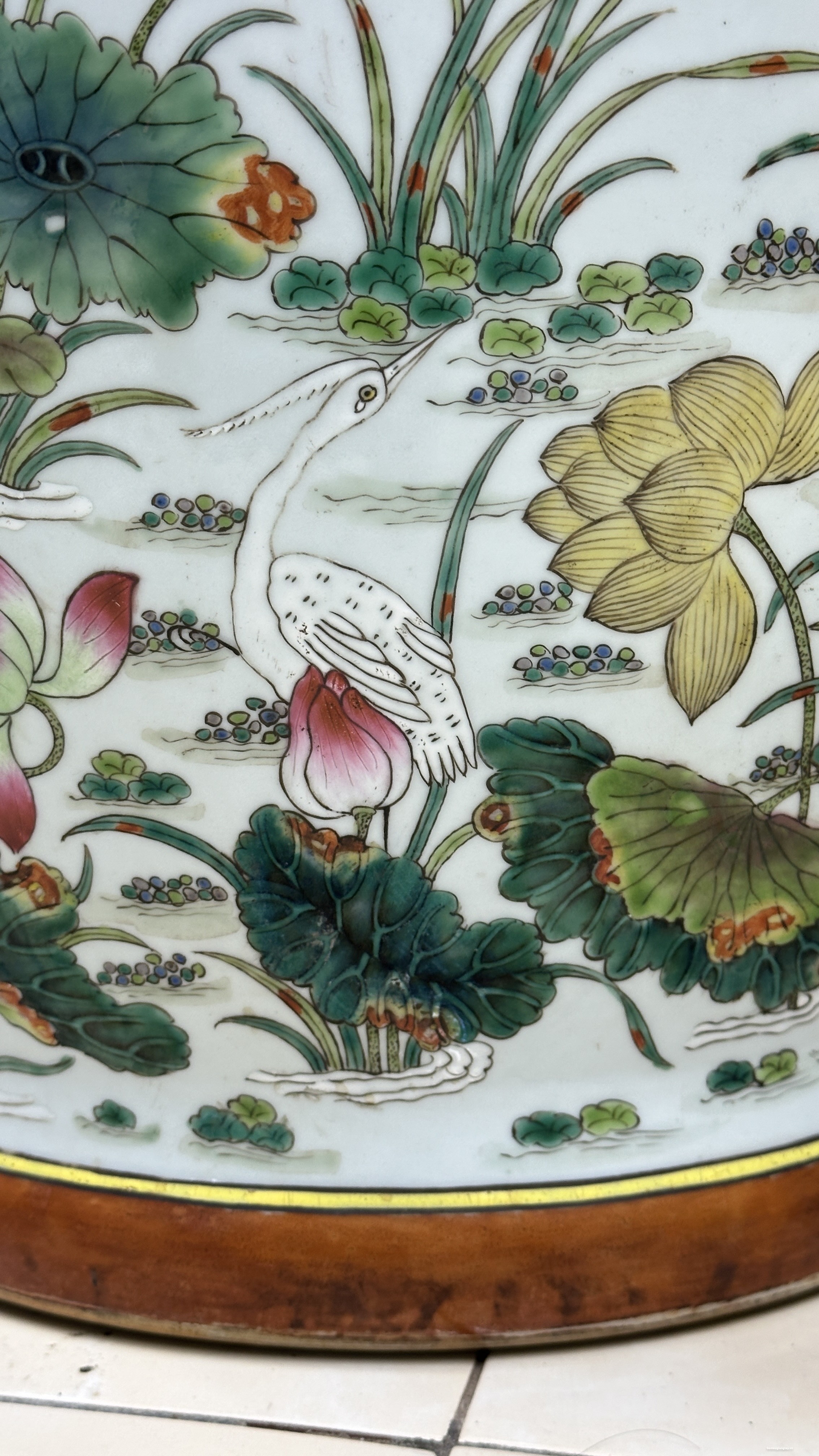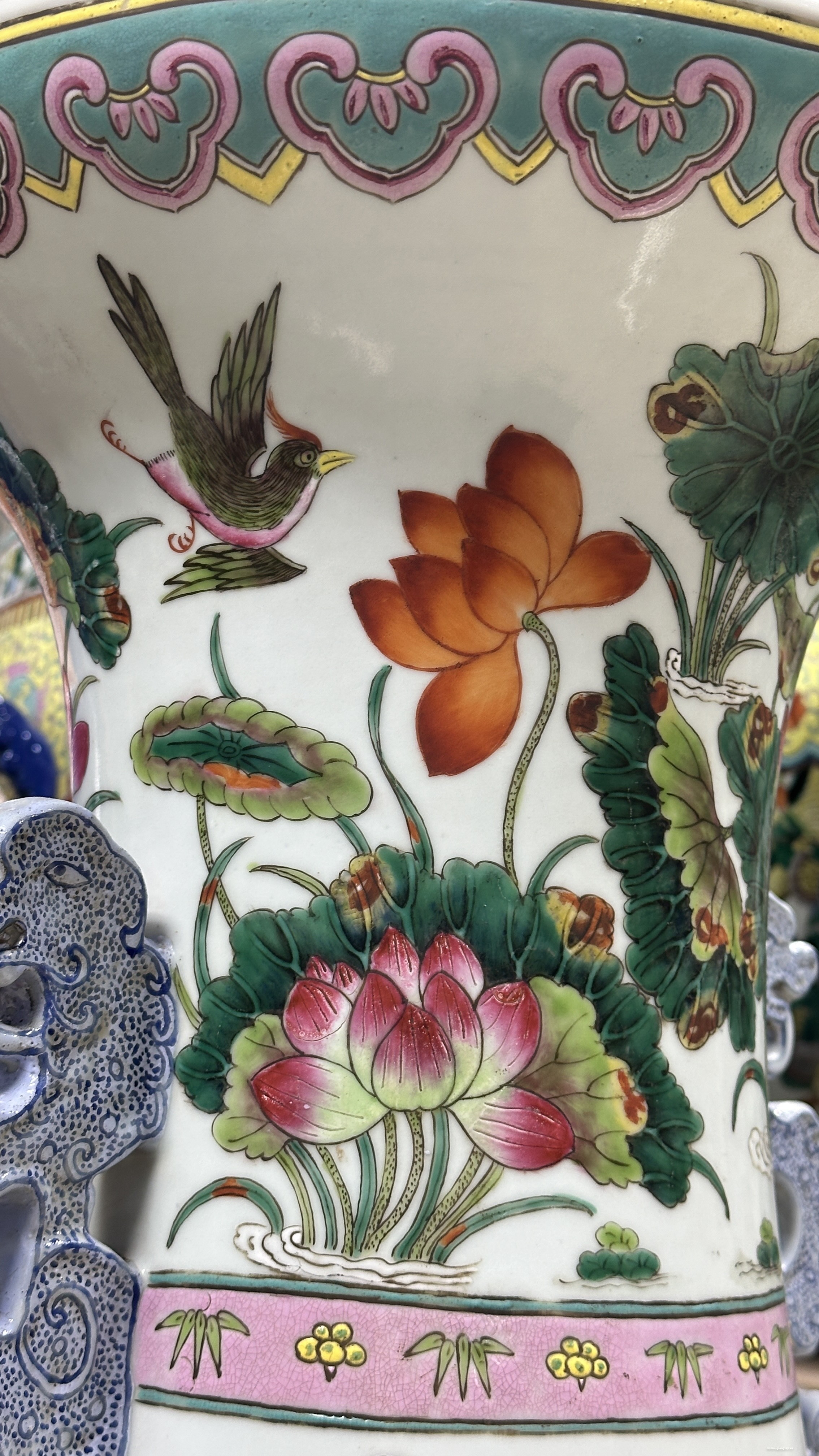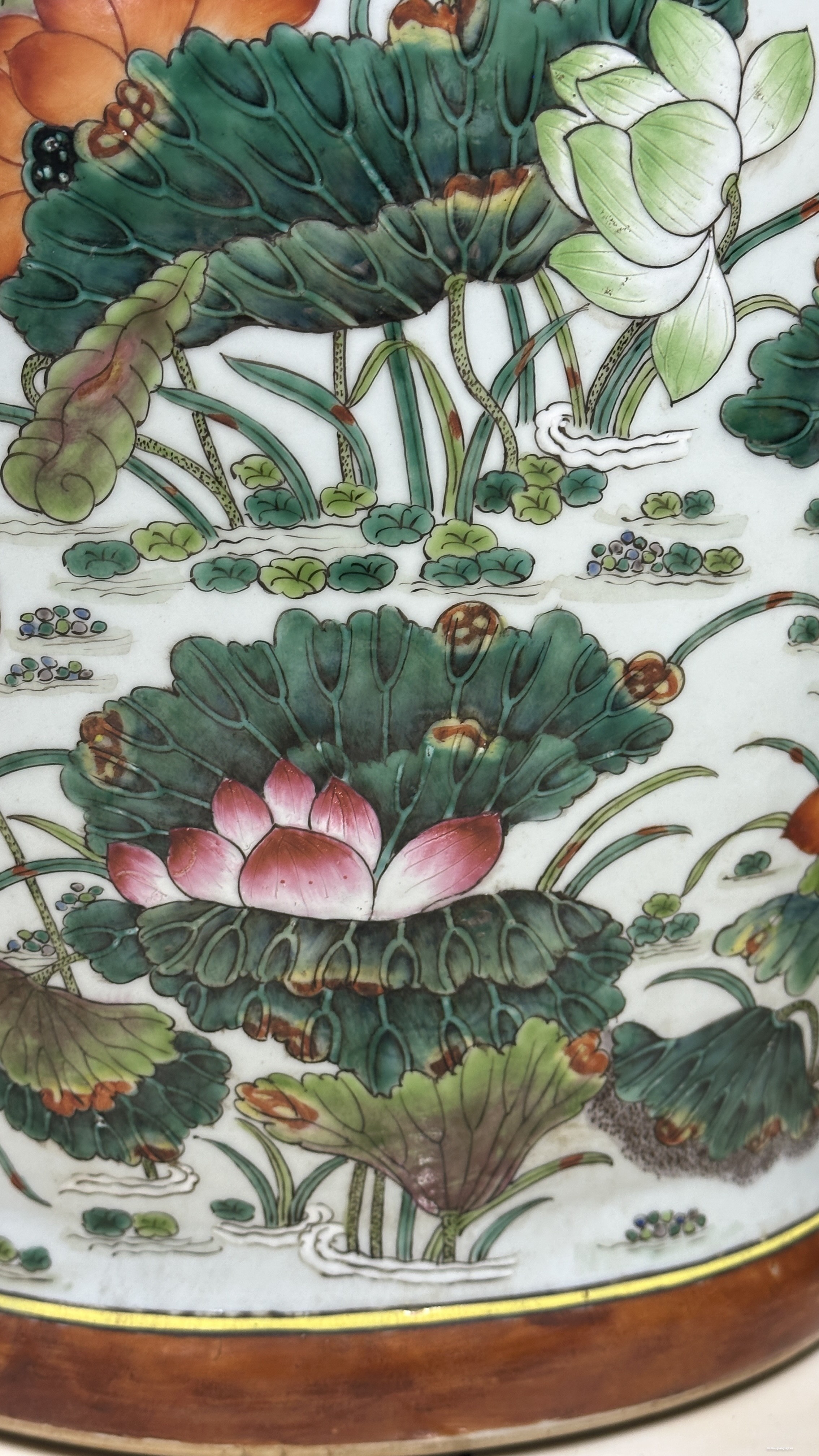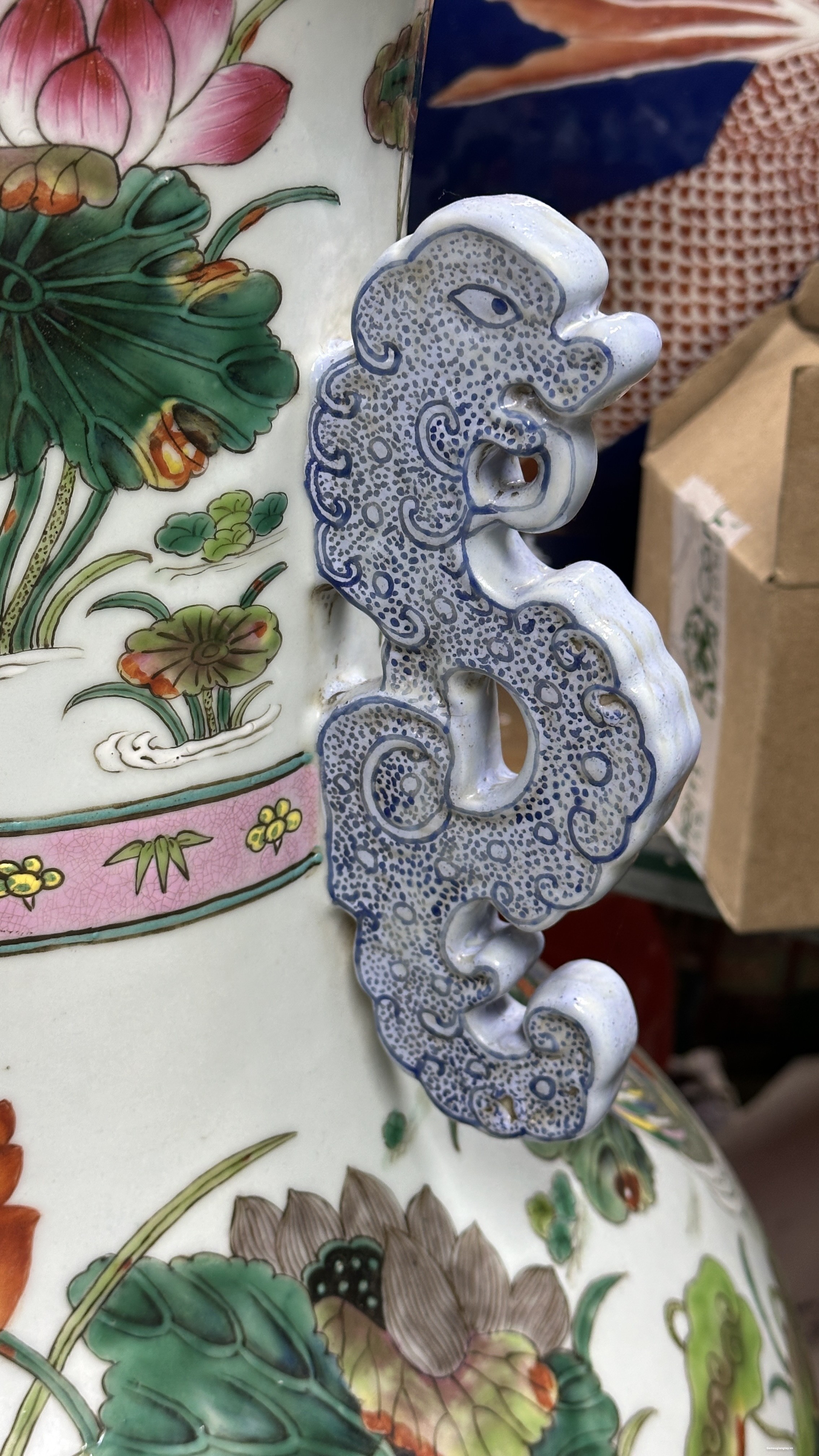 Đôi bình vẽ sen vịt Men màu cũ tơ tóc , vẽ tay nung củi hàng kỹ thuật cao, chôn và cốt khá già đồ, có tí tuổi thời gian tầm 50 , 60 năm.