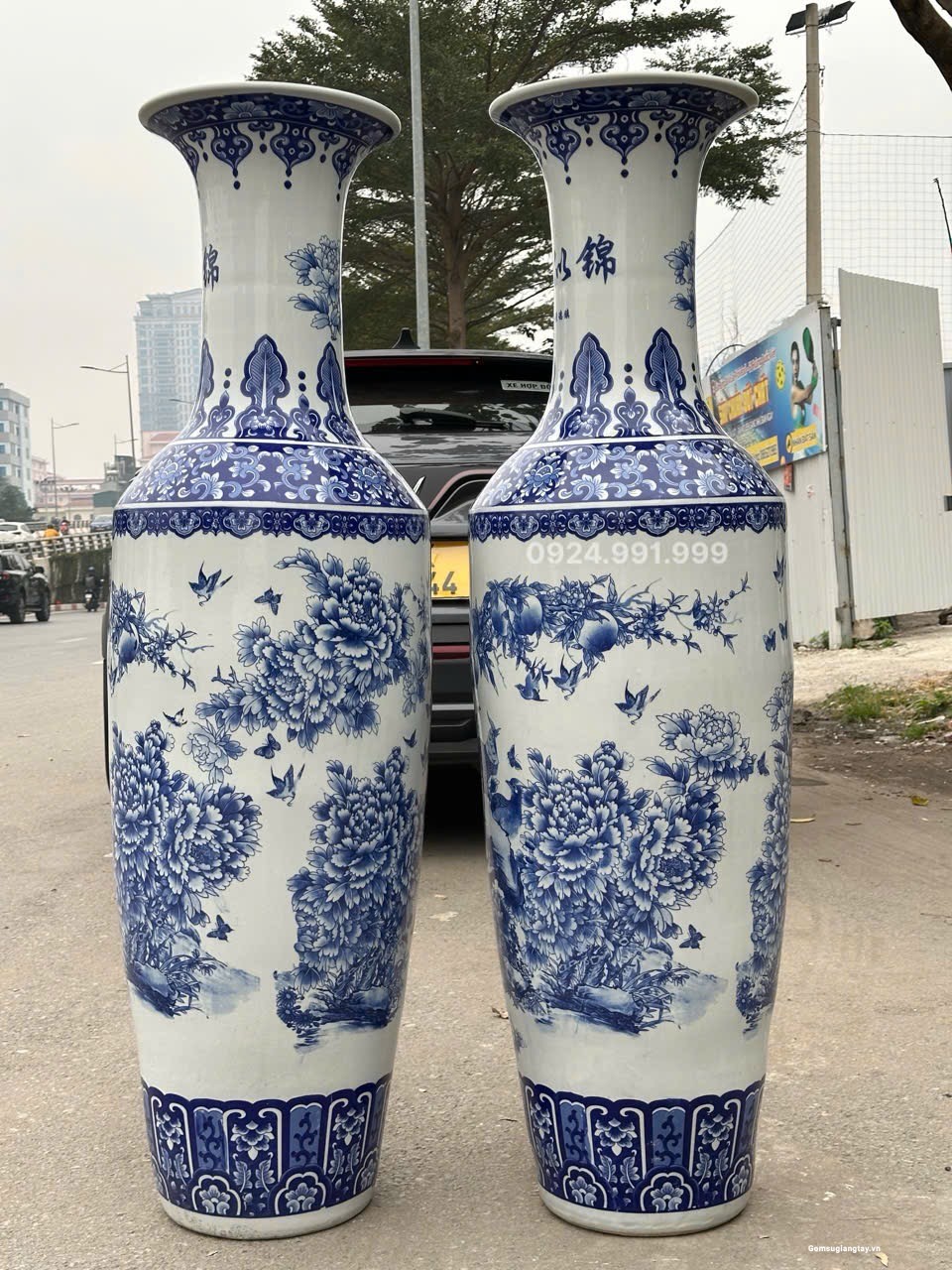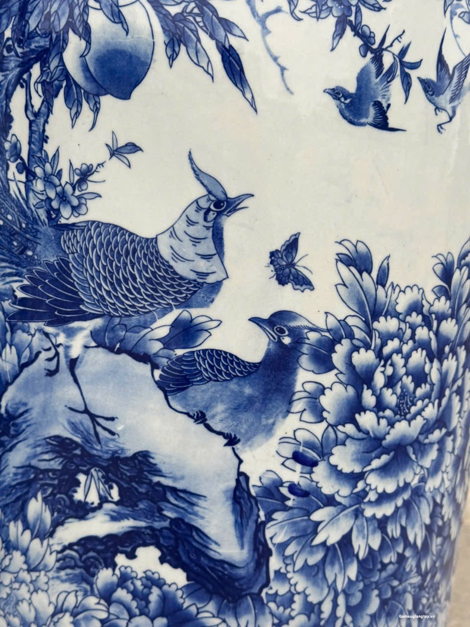 Cặp lục bình tích Bách Điểu Chầu Phượng là mẫu gốm sứ phong thủy được ưa chuộng nhờ vẻ đẹp cổ điển và ý nghĩa cát tường. Họa tiết phượng hoàng uy nghi kết hợp đàn chim tụ hội tượng trưng cho phú quý, thịnh vượng, quy tụ tài lộc và quý nhân phù trợ. Dáng bình cao, thân nở, miệng loe tạo cảm giác vững chãi, rất phù hợp đặt phòng khách, sảnh lớn, biệt thự, cơ quan, nhà thờ họ hoặc hai bên ban thờ trang nghiêm. Men xanh lam giả cổ sâu màu, sang trọng, giúp tổng thể nổi bật và bền đẹp theo thời gian.