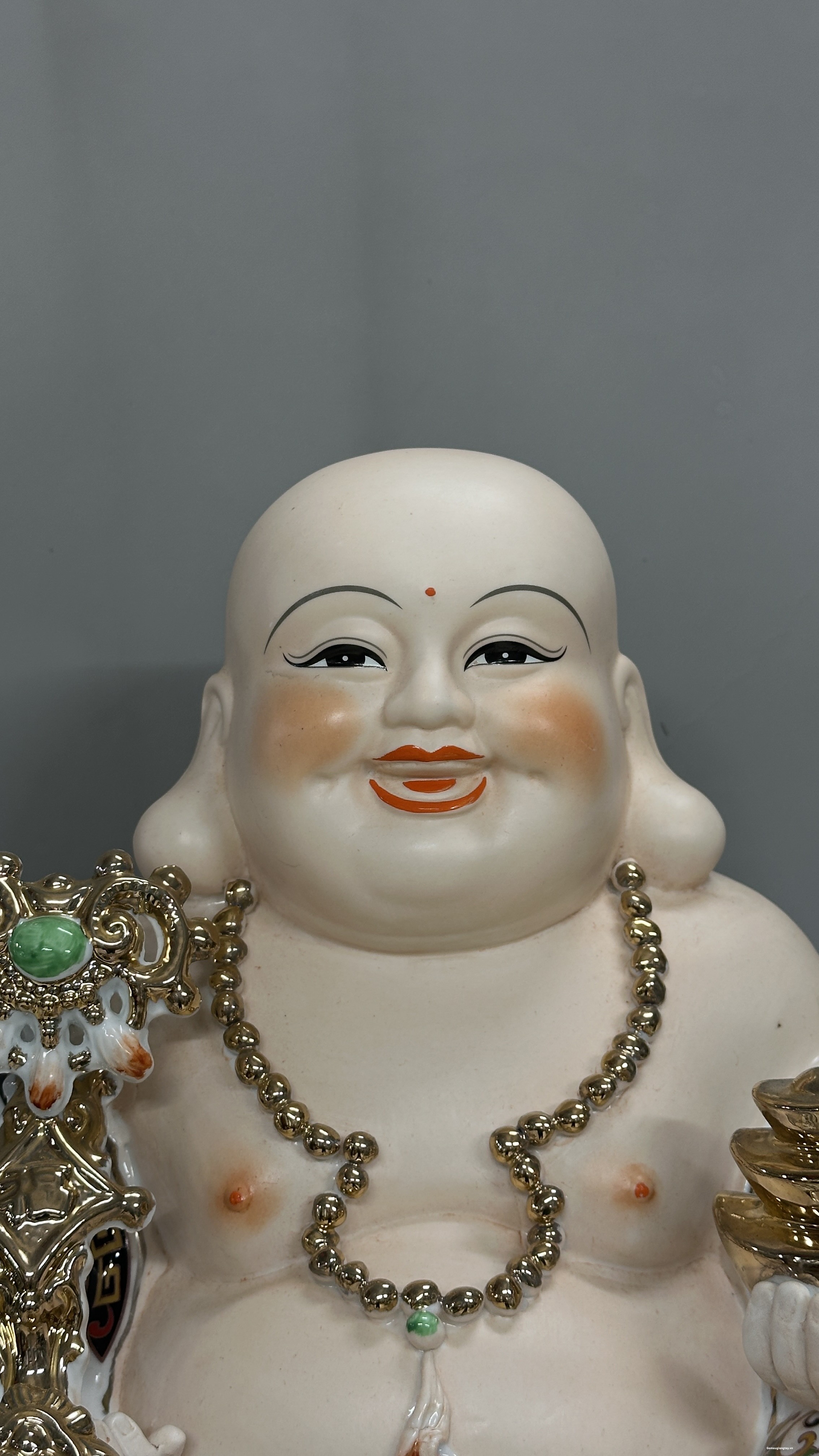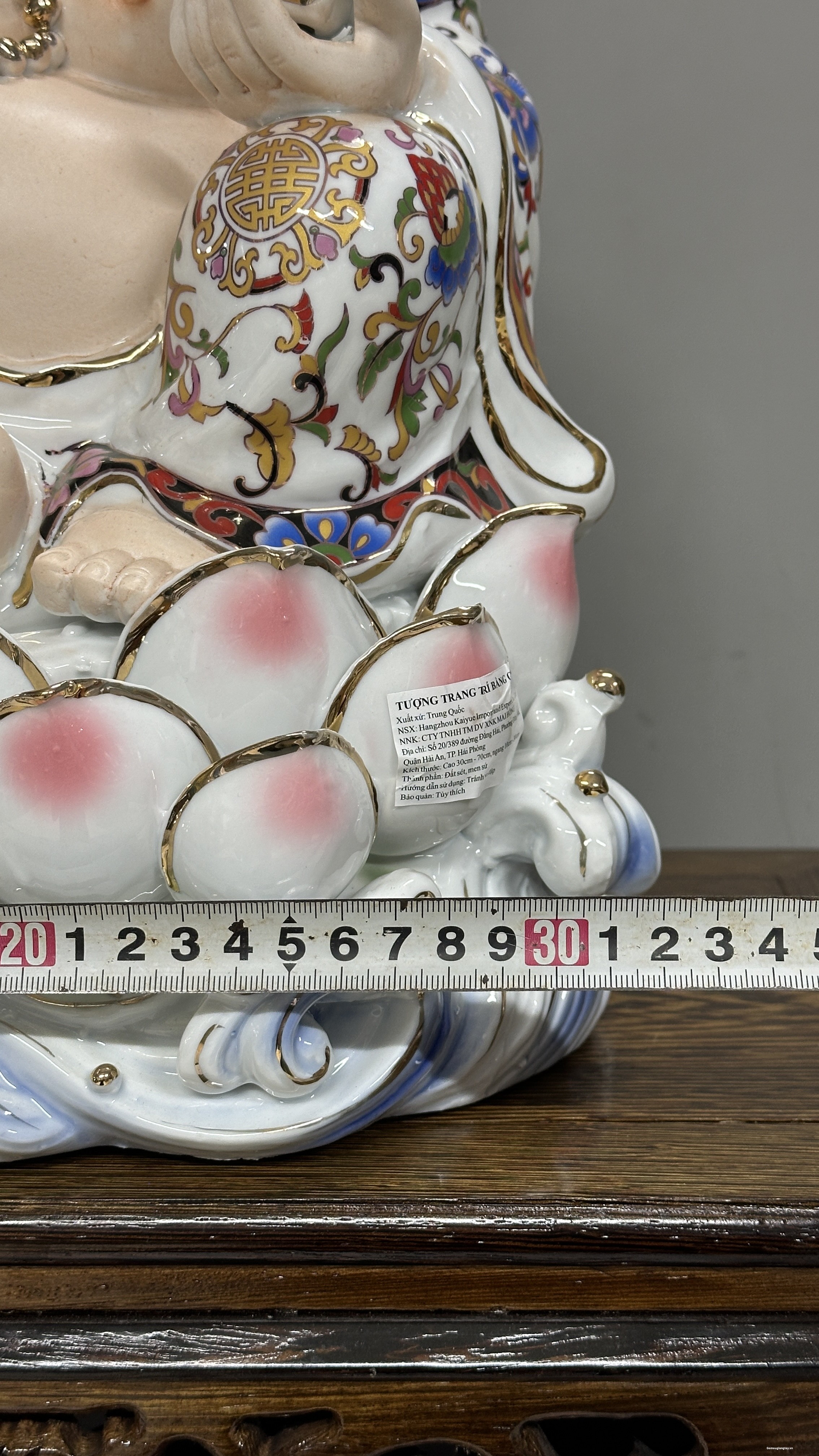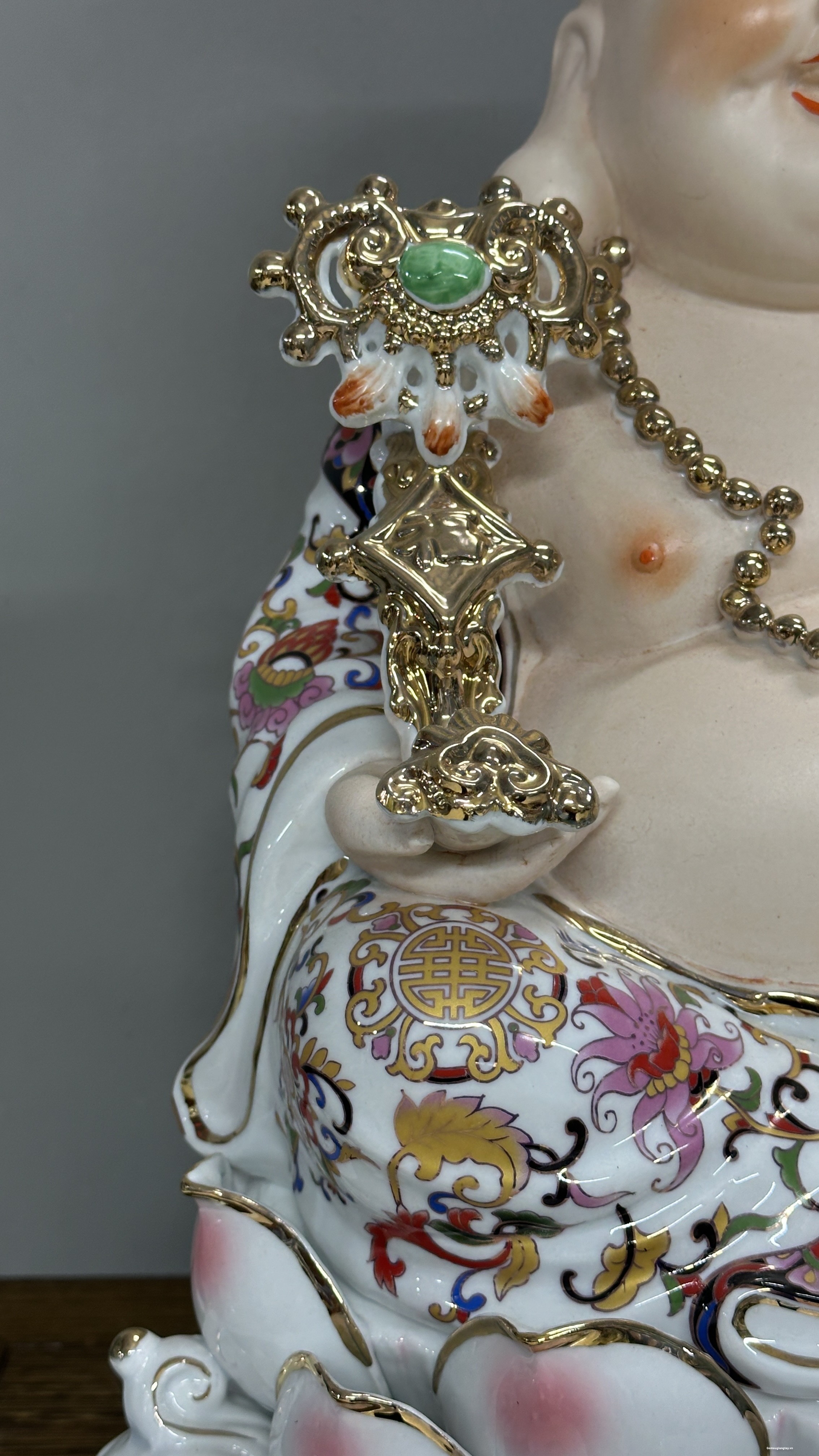 Tượng di lặc cụ ngồi đài sen rất bề thế, rất đẹp được nung với nhiệt độ cao cực kỳ bền.
