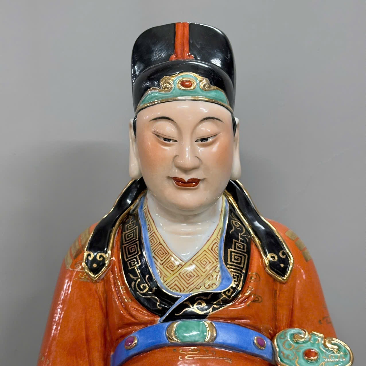 • Gốm sứ Cảnh Đức Trấn, men bóng, họa tiết tỉ mỉ, phối đỏ cam – xanh – nhũ vàng nổi bật